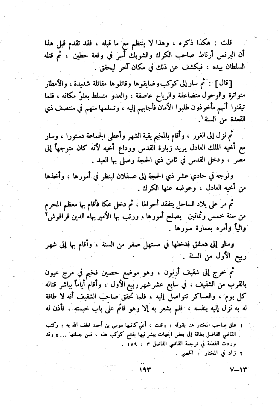 قلت: هكذا ذكره، وهذا لا ينتظم مع ما قبله، فقد تقدم قبل هذا أن البرنس أرناط صاحب الكرك والشوبك أسر في وقعة حطين، ثم قتله السلطان بيده، فيكشف عن ذلك في مكان آخر ليحقق.