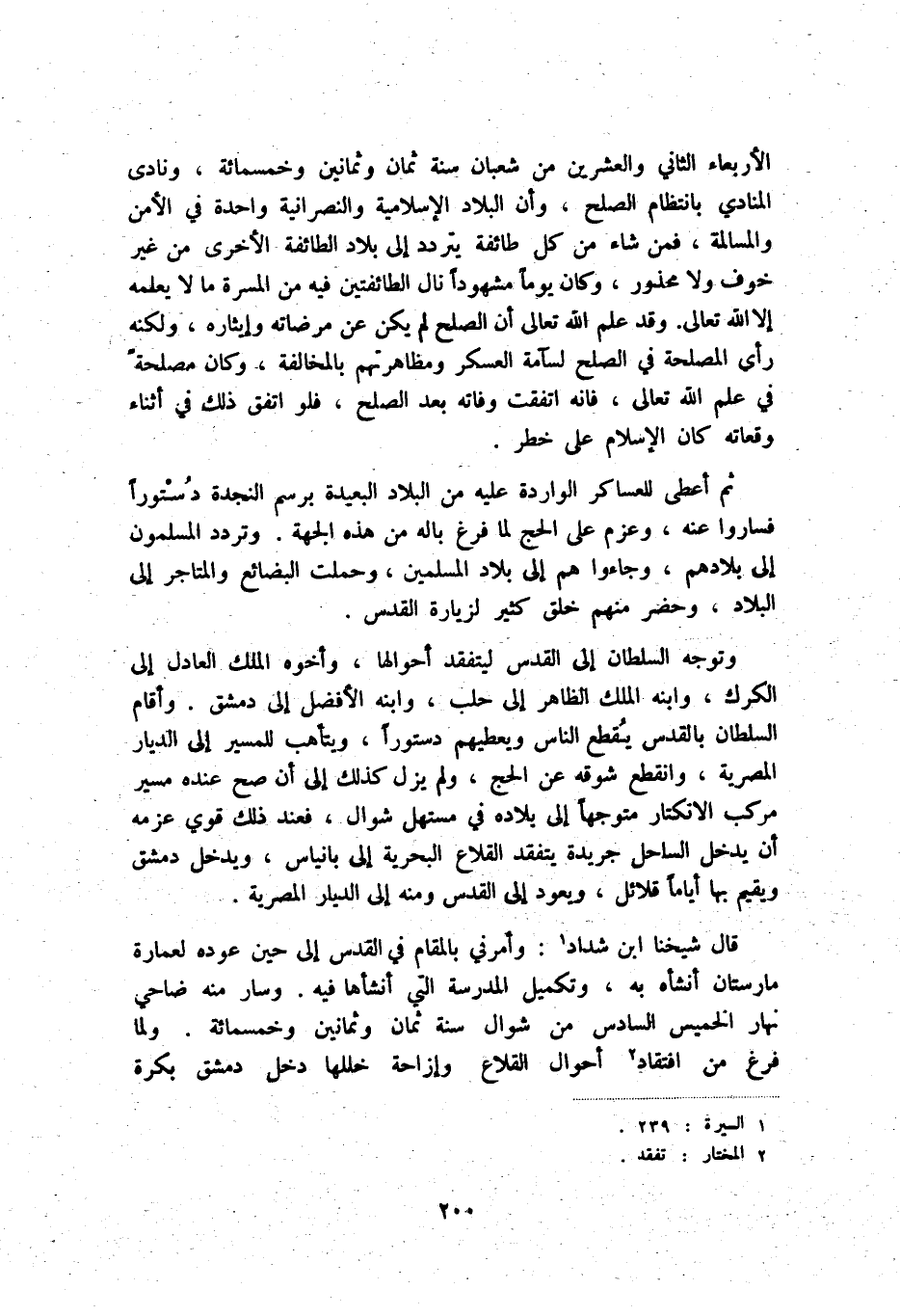 ثم أعطى للعساكر الواردة عليه من البلاد البعيدة برسم النجدة دستوراً فساروا عليه، وعزم على الحج لما فرغ باله من هذه الجهة. وتردد المسلمون إلى بلادهم، وجاءوا هم إلى بلاد المسلمين، وحملت البضائع والمتاجر إلى البلاد، وحضر منهم خلق كثير لزيارة القدس.