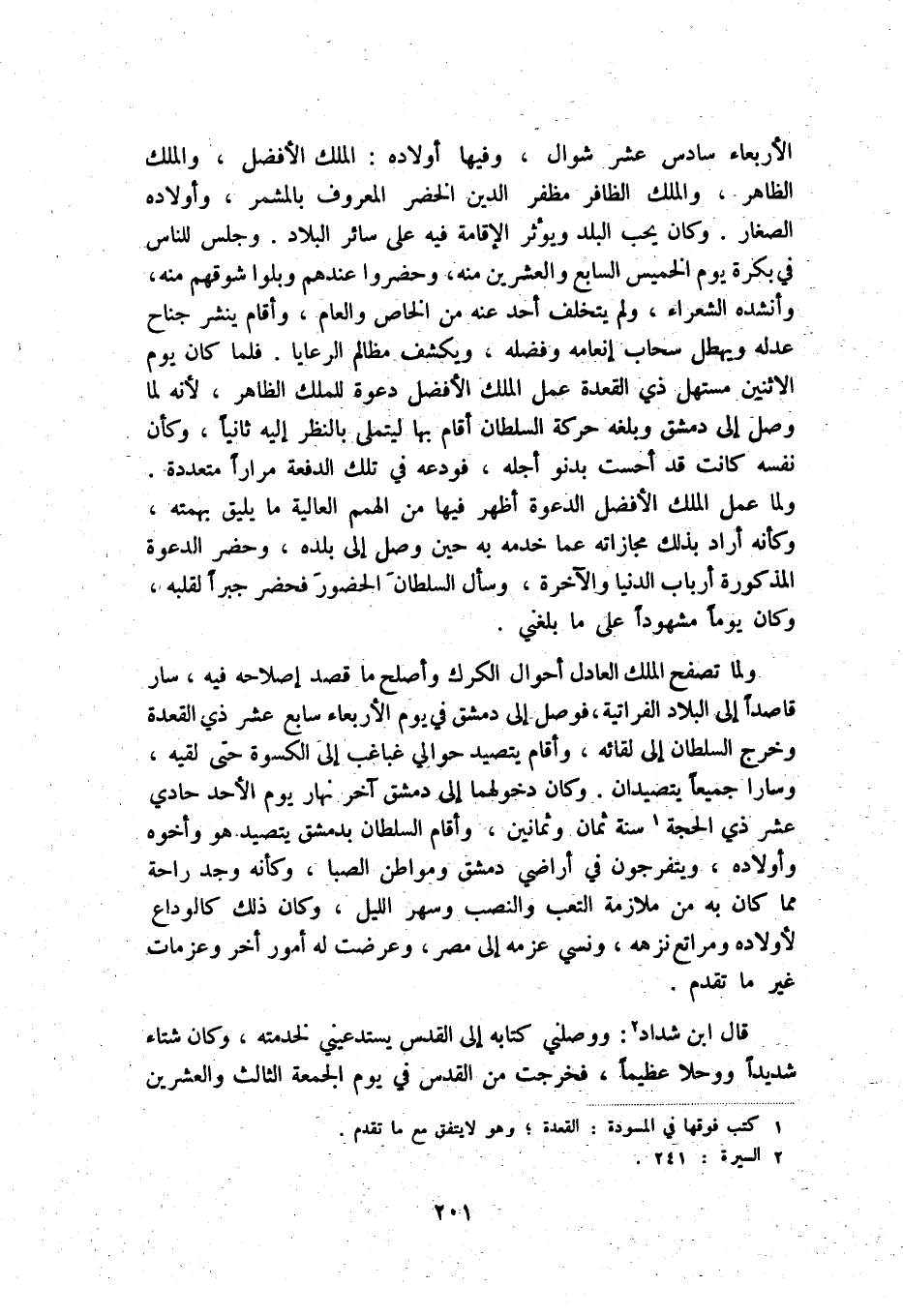 قال ابن شداد (2) : ووصلني كتابه إلى القدس يستدعيني لخدمته، وكان شتاء شديداً ووحلاً عظيماً، فخرجت من القدس في يوم الجمعة الثالث والعشرين