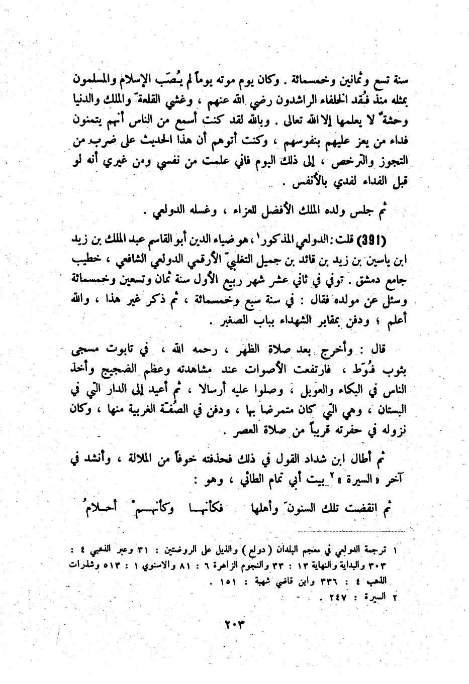 (391) قلت: الدولعي المذكور (1) ، هو ضياء الدين أبو القاسم عبد الملك بن زيد بن ياسين بن زيد بن قائد بن جميل التغلبي الأرقمي الدولعي الشافعي، خطيب جامع دمشق. توفي في ثاني عشر شهر ربيع الأول سنة ثمان وتسعين وخمسمائة وسئل عن مولده فقال: في سنة سبع وخمسمائة، ثم ذكر غير هذا، والله أعلم؛ ودفن بمقابر الشهداء بباب الصغير.