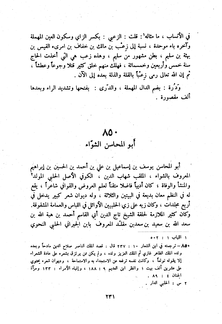 أبو المحاسن يوسف بن إسماعيل بن علي بن أحمد بن الحسين بن إبراهيم المعروف بالشواء، الملقب شهاب الدين، الكوفي الأصل الحلبي المولد (3) والمنشأ والوفاة؛ كان أديباً فاضلاً متقناً لعلم العروض والقوافي شاعراً، يقع له في النظم معان بديعة في البيتين والثلاثة، وله ديوان شعر كبير يدخل في أربع مجلدات، وكان زيه على زي الحلبيين الأوائل في اللباس والعمامة المشقوقة. وكان كثير الملازمة لحلقة الشيخ تاج الدين أبي القاسم أحمد بن هبة الله بن سعد الله بن سعيد بن سعد بن مقلد المعروف بابن الجبراني الحلبي النحوي