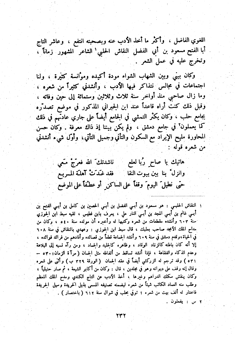 (1) النقاش الحلبي: هو مسعود بن أبي الفضل بن أبي الحصين بن كامل بن أبي الفتح بن أبي غانم بن أبي المجد بن أبي النار علي، يعرف بابن قطيس، لقيه سبط ابن الجوزي سنة 602 وأنشده مقطعات من شعره وكتبها له وأخبره أن مولده سنة 540، وكان من مداح الملك الأمجد صاحب بعلبك، قال سبط ابن الجوزي: وعهدي بالنقاش في سنة 608 في الحياة، وقدم دمشق في سنة 609 وأنشد الجماعة قطعاً من قصائده وأفادهم من فرائد فوائده، إلا أنه كان باطنه كالزناد الوقاد، وظاهره كالجليد والجماد، ومن رآه نسبه إلى البلاهة وعدم الذكاء والفقاهة، فإذا أنشد تساقط من ألفاظه مثل الجمان (مرآة الزمان: 530 - 531) وقد ترجم على ديوانه وهو في مجلدين، قال: وكان من أكابر الشيعة، ثم صار حنبلياً، وكان ينقش سكك الدراهم وغيرها، أخذ الأدب عن التاج الكندي ومدح الملك امعظم وطلب منه العماد الكاتب شيئاً من شعره ليضمنه تصنيفه المسمى بذيل الخريدة وسيل الجريدة فاختار له ألف بيت من شعره؛ توفي بحب في شوال سنة 612 (باختصار) .