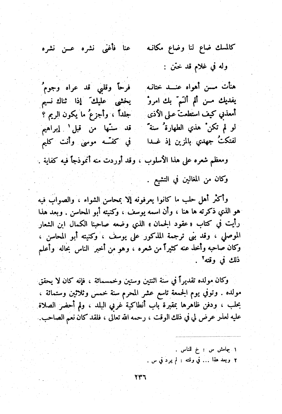 وأكثر أهل حلب ما كانوا يعرفونه إلا بمحاسن الشواء. والصواب فيه هو الذي ذكرته هاهنا، وأن اسمه يوسف، وكنيته أبو المحاسن. وبعد هذا رأيت في كتاب " عقود الجمان " الذي وضعه صاحبنا الكمال بن الشعار الموصلي، وقد بنى ترجمة المذكور على يوسف، وكنيته أبو المحاسن، وكان صاحبه وأخذ عنه كثيراً من شعره، وهو من أخبر الناس بحاله وأعلم ذلك في وقته (2) .