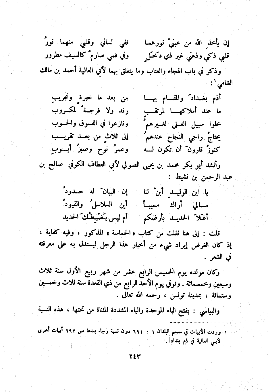 أغلا الحديد بأرضكم ... أم ليس يضبطك الحديد قلت: إلى هنا نقلت من كتاب " الحماسة " المذكور، وفيه كفاية، إذ كان الغرض إيراد شيء من أخبار هذا الرجل ليستدل به على معرفته بالشعر.