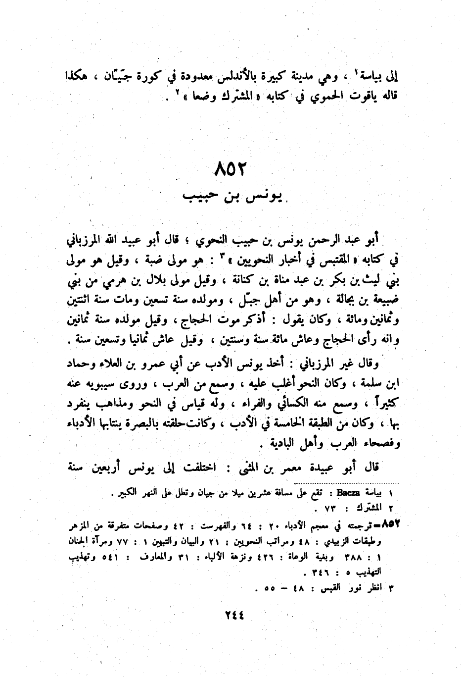 (3) ترجمته في معجم الأدباء 20: 64 والفهرست: 42 وصفحات متفرقة من المزهر وطبقات الزبيدي: 48 ومراتب النحويين: 21 والبيان والتبيين 1: 77 ومرآة الجنان 1: 388 وبغية الوعاة: 426 ونزهة الألباء: 31 والمعارف: 541 وتهذيب التهذيب 5: 346.