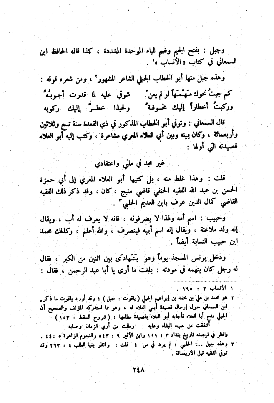 (2) هو محمد بن علي بن محمد بن إبراهيم الجبلي (ياقوت: جبل) ؛ وقد أورد ياقوت ما ذكره ابن السمعاني حول إرسال قصيدة أبي العلاء له، وهو مما استدركه المؤلف والصحيح أن الجبلي مدح أبا العلاء بقصيدة مطلعها: (شروح السقط: 153)