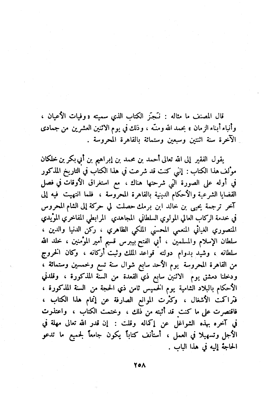 يقول الفقير إلى الله تعالى أحمد بن محمد بن إبراهيم بن أبي بكر بن خلكان مؤلف هذا الكتاب: إنني كنت قد شرعت في هذا الكتاب في التاريخ المذكور في أوله على الصورة التي شرحتها هناك، مع استغراق الأوقات في فصل القضايا الشرعية والأحكام الدينية بالقاهرة المحروسة، فلما انتهيت فيه إلى آخر ترجمة يحيى بن خالد بن برمك حصلت لي حركة إلى الشام المحروس في خدمة الركاب العالي المولوي السلطاني المجاهدي المرابطي المفاخري المؤيدي المنصوري الغيائي المنعمي المحسني الملكي الظاهري، ركن الدنيا والدين، سلطان الإسلام والمسلمين، أبي الفتح بيبرس قسيم أمير المؤمنين، خلد الله سلطانه، وشيد بدوام دولته قواعد الملك وثبت أركانه، وكان الخروج من القاهرة المحروسة يوم الأحد سابع شوال سنة تسع وخمسين وستمائة، ودخلنا دمشق يوم الإثنين سابع ذي القعدة من السنة المذكورة، وقلدني الأحكام بالبلاد الشامية يوم الخميس ثامن ذي الحجة من السنة المذكورة، فتراكمت الأشغال، وكثرت الموانع الصارفة عن إتمام هذا الكتاب، فاقتصرت على ما كنت قد أثبته من ذلك، وختمت الكتاب، واعتذرت في آخره بهذه الشواغل عن إكماله وقلت: إن قدر الله تعالى مهلة في الأجل وتسهيلاً في العمل، أستأنف كتاباً يكون جامعاً لجميع ما تدعو الحاجة إليه في هذا الباب.