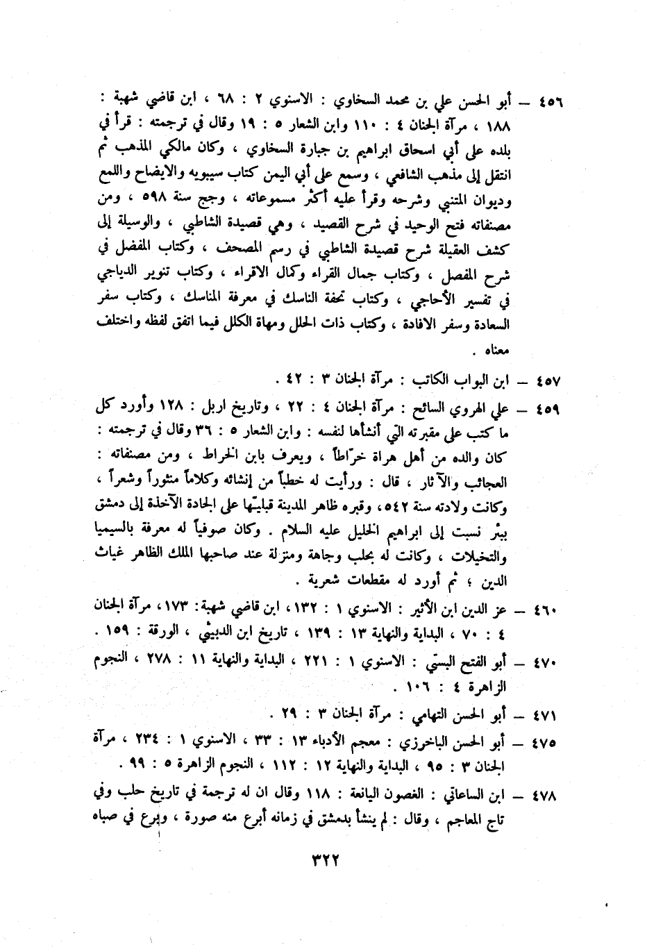 456 - أبو الحسن علي ن محمد السخاوي: الاسنوي 2: 68، ابن قاضي شهبة: 188، مرآة الجنان 4: 110 وابن الشعار 5: 19 وقال في ترجمته: قرأ في بلده على أبي إسحاق إبراهيم ن جبارة السخاوي، وكان مالكي المذهب ثم انتقل إلى مذهب الشافعي، وسمع على أبي اليمن كتاب سيبويه والإيضاح واللمع وديوان المتنبي وشرحه وقرأ عليه أكثر مسموعاته، وجج سنة 598، ومن مصنفاته فتح الوحيد في شرح القصيد، وهي قصيدة الشاطبي في رسم المصحف، وكتاب المفضل في كشف العقلية شرح قصيدة الشاطبي في رسم المصحف، وكتاب المفضل في شرح المفصل، وكتاب جمال القراء وكمال الإقراء، وكتاب تنوير الدياجي في تفسير الأحاجي، وكتاب تحفة الناسك في معرفة المناسك، وكتاب سفر السعادة وسفر الإفادة، وكتاب ذات الحلل ومهاة الكلل فيما اتفق لفظه واختلف معناه.
