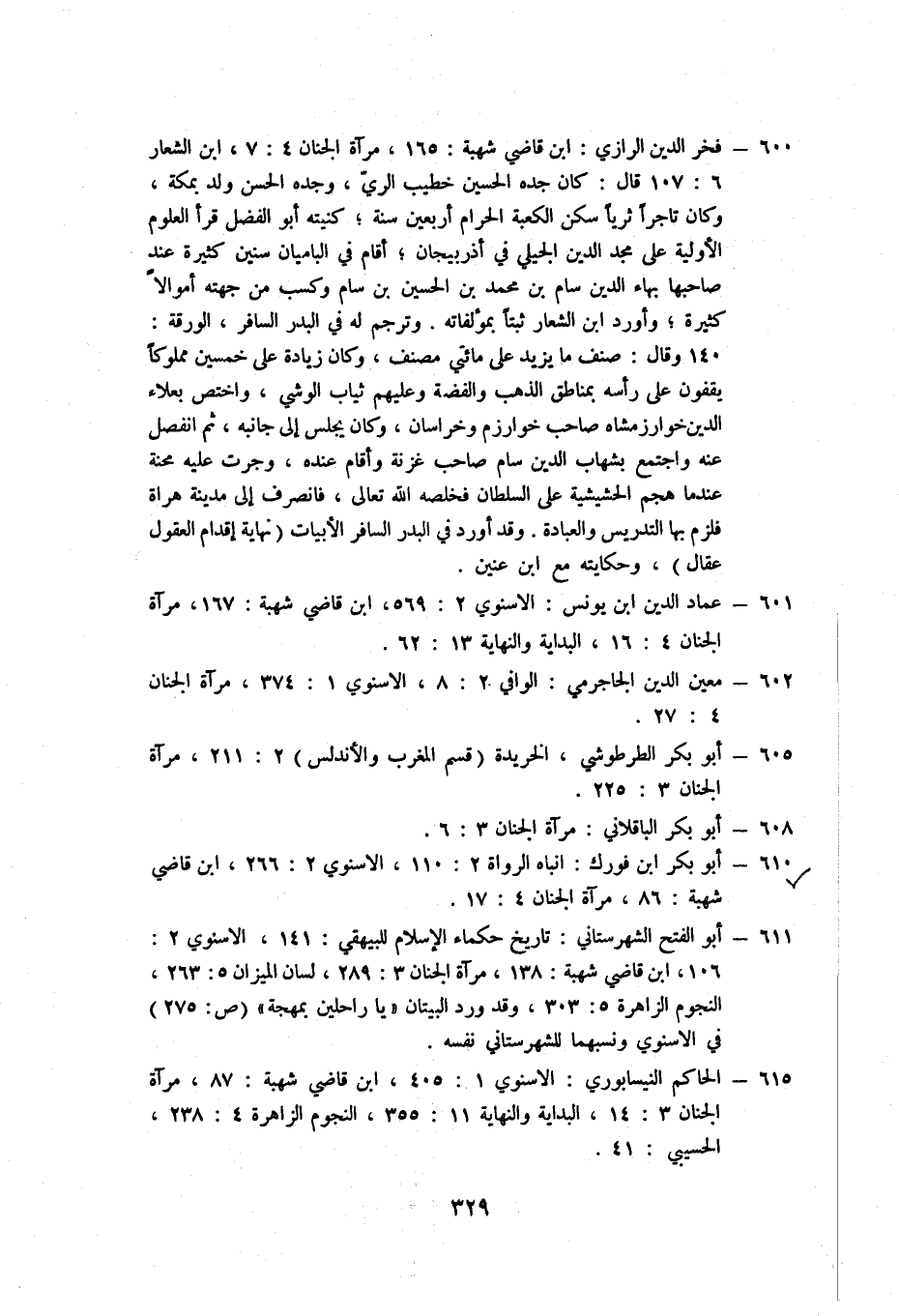 611 - أبو الفتح الشهرستاني: تاريخ حكماء الإسلام للبيهقي: 141، الاسنوي 2: 106، ابن قاضي شهبة: 138، مرآة الجنان 3: 289، لسان الميزان 5: 263، النجوم الزاهرة 5: 303، وقد ورد البيتان " يا راحلين بمهجة " (ص: 275) في الاسنوي ونسبهما للشهرستاني نفسه.