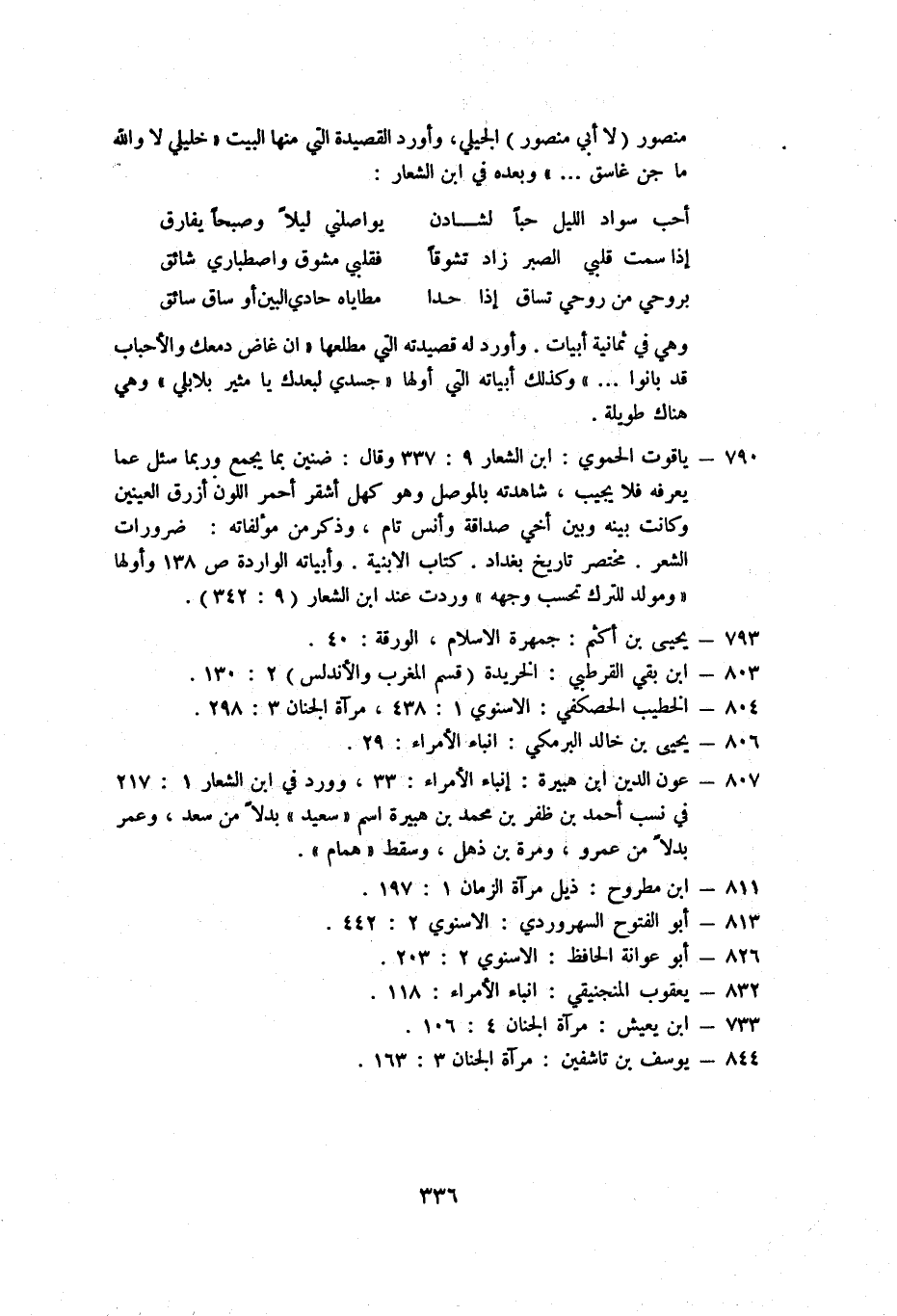 790 - ياقوت الحموي: ابن الشعار 9: 337 وقال: ضنين بما يجمع وربما سئل عما يعرفه فلا يجيب، شاهدته بالموصل وهو كهل اشقر أحمر اللون أزرق العينين وكانت بينه وبين أخي صداقة وأنس تام، وذكر من مؤلفاته: ضرورات الشعر. مختصر تاريخ بغداد. كتاب الأبنية. وأبياته الواردة ص 138 وأولها " ومولد للترك تحسب وجهه " وردت عند ابن الشعر (9: 342) .