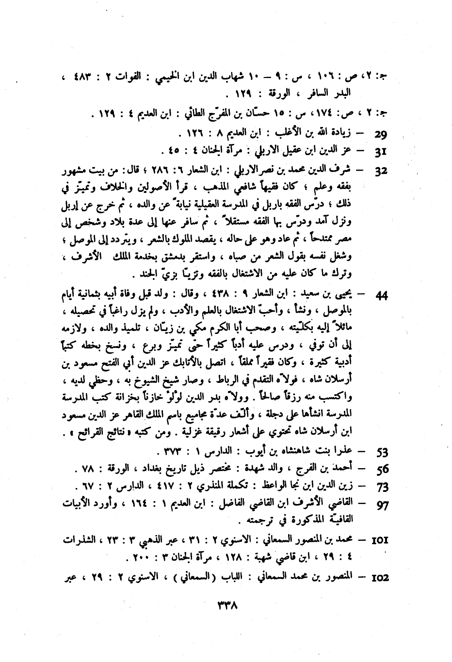 32 - شرف الدين محمد بن نصر الاربلي: ابن الشعار 6: 286؛ قال: من بيت مشهور بفقه وعلم؛ كان فقيهاً شافعي المذهب، قرأ الأصولين والخلاف وتميز في ذلك؛ درس الفقه باربل في المدرسة العقيلية نيابة عن والده، ثم خرج عن إربل ونزل آمد ودرس بها الفقه مستقلاً، ثم سافر عنها إلى عدة بلاد وشخص إلى مصر ممتدحاً، ثم عاد وهو على حاله، يقصد الملوك بالشعر، ويتردد إلى الموصل؛ وشغل نفسه بقول الشعر من صباه، واستقر بدمشق بخدمة الملك الأشرف، وترك ما كان عليه من الاشتغال بالفقه وتزيا بزي الجند.