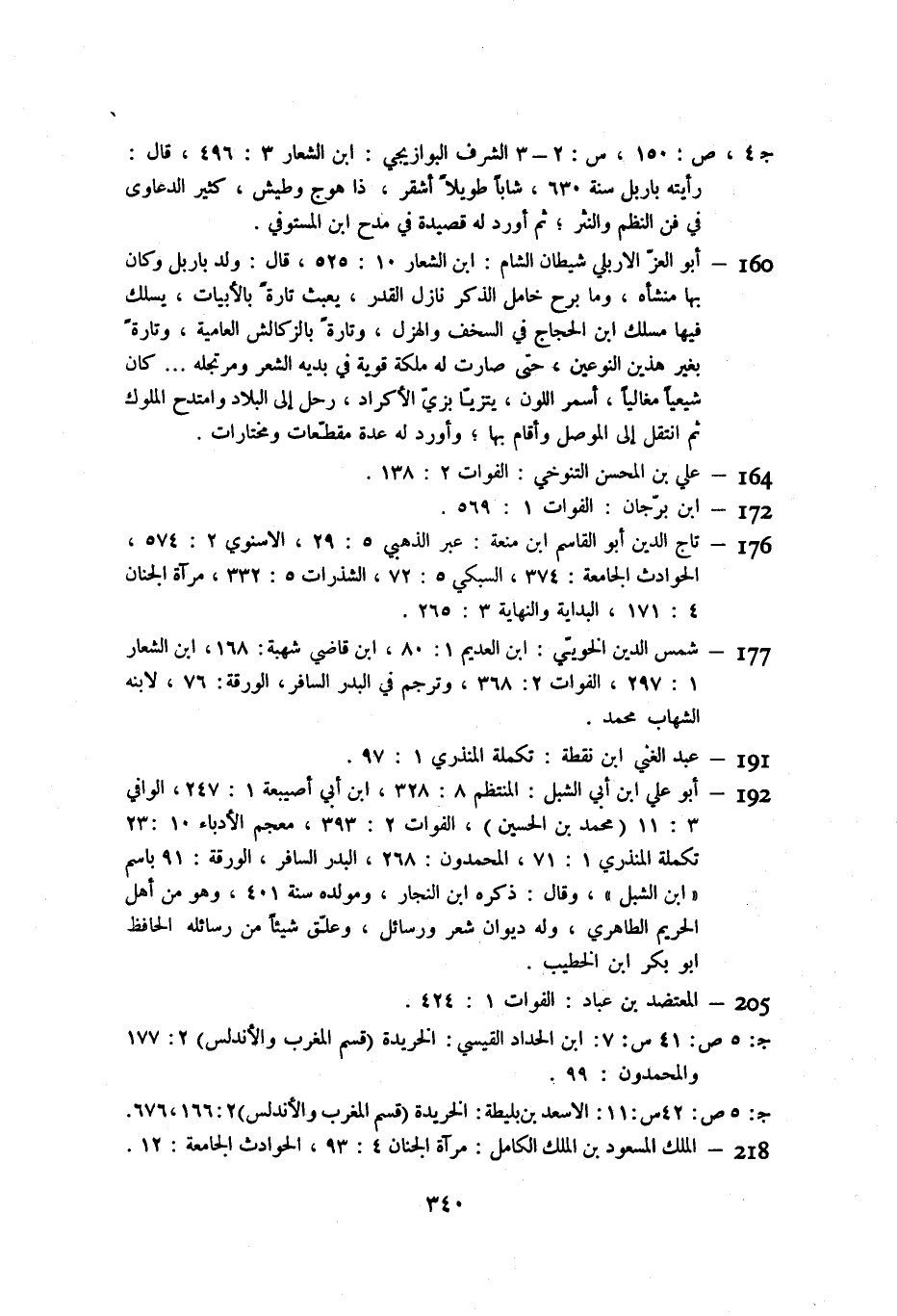 160 - أبو العز الاربلي شيطان الشام: ابن الشعار 10: 525، قال: ولد باربل وكان بها منشأه، وما برح خامل الذكر نازل القدر، يعبث تارةً بالأبيات، يسلك فيها مسلك ابن الحجاج في السخف والهزل، وتارةً بالزكالش العامية، وتارةً بغير هذين النوعين، حتى صارت له ملكة قوية في بديه الشعر ومرتجله كان شيعياً مغالياً، أسمر اللون، يتزيا بزي الأكراد، رحل إلى البلاد وامتدح الملوك ثم انتقل إلى الموصل وأقام بها؛ وأورد له عدة مقطعات ومختارات.