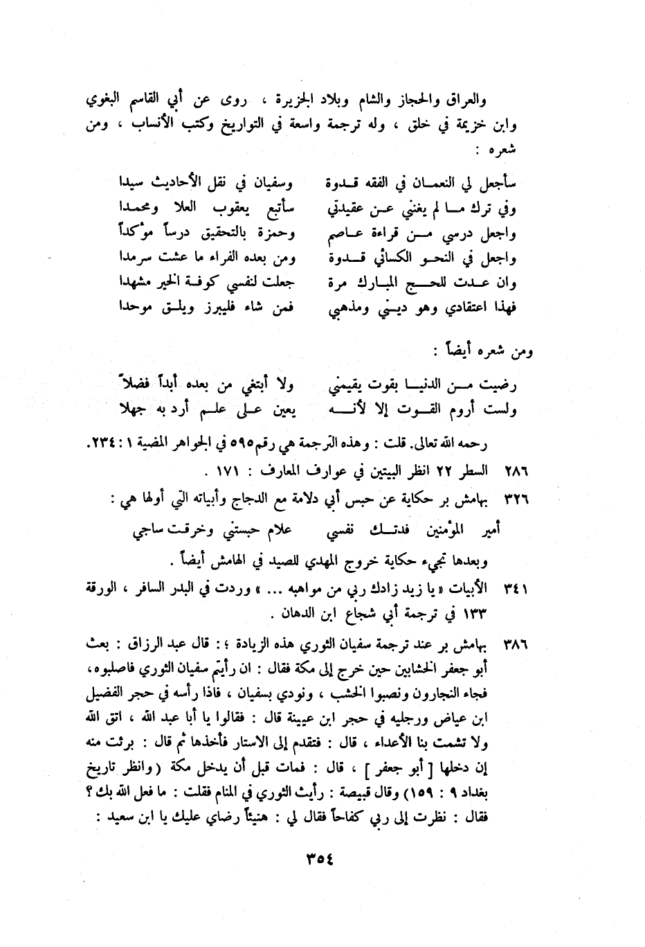 386 - بهامش بر عند ترجمة سفيان الثوري هذه الزيادة؛: قال عبد الرزاق: بعث أبو جعفر الخشابين حين خرج إلى مكة فقال: إن رأيتم سفيان الثوري فاصلبوه، فجاء النجارون ونصبوا الخشب، ونودي بسفيان، فإذا رأسه في حجر الفضيل ابن عياض ورجليه في حجر ابن عيينة قال: فقالوا يا أبا عبد الله، اتق الله ولا تشمت بنا الأعداء، قال: فتقدم إلى الأستار فأخذها ثم قال: برئت منه إن دخلها [أبو جعفر] ، قال: فمات قبل ان يدخل مكة (وانظر تاريخ بغداد 9: 159) وقال قبيصة: رأيت الثوري في المنام فقلت: ما فعل الله بك فقال: نظرت إلى ربي كفاحاً فقال لي: هنيئاً رضاي عليك يا ابن سعيد: