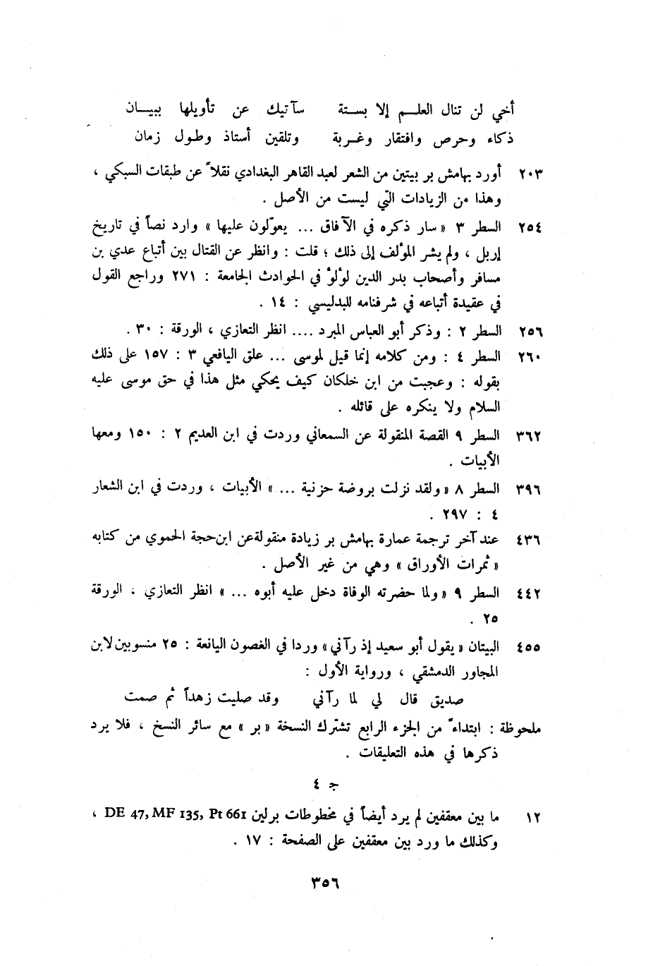 ذكاء وحرص وافتقار وغربة ... وتلقين أستاذ وطول زمان 203 أورد بهامش بر بيتين من الشعر لعبد القاهر البغدادي نقلاً عن طبقات السبكي، وهذا من الزيادات التي ليست من الأصل.