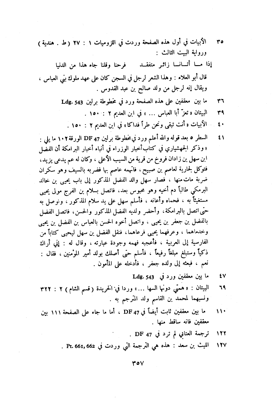41 - السطر 5 بعد قوله والله أعلم ورد في مخطوطة برلين DF 47 الورقة 102 ما يلي: " وذكر الجهشياري ف كتاب أخبار الوزراء في أنباء أخبار البرامكة أن الفضل ابن سهل بن زادان فروخ من قرية من السيب الأعلى، وكان له عم يدعى يزيد، فتوكل لجارية لعاصم بن صبيح، فاتهمه عاصم بها فضربه بالسيف وهو سكران ضربة مات فيها، فصار سهل والد الفضل المذكور إلى باب يحيى بن خالد البرمكي طالباً دم أخيه وهو محبوس بعد، فاتصل بسلام بن الفرج مولى يحيى مستغيثاً به، فحماه وأعانه، فأسلم سهل على يد سلام المذكور، وفوصل به حتى اتصل بالبرامكة، وأحضر ولديه الفضل المذكور والحسن، فاتصل الفضل بالفضل بن جعفر بن يحيى، واتصل أخوه الحسن بالعباس بن الفضل بن يحيى وخدماهما، وعرفهما يحيى فرعاهما، فنقل الفضل بن سهل ليحيى كتاباً من الفارسية إلى العربية، فأعجبه فهمه وجودة عبارته، وقال له: إني أراك ذكياً وستبلغ مبلغاً رفيعاً، فأسلم حتى أوصلك بولد أمير المؤمنين، فقال: نعم، فبعثه إلى ولده جعفر، فأدخله على المأمون.