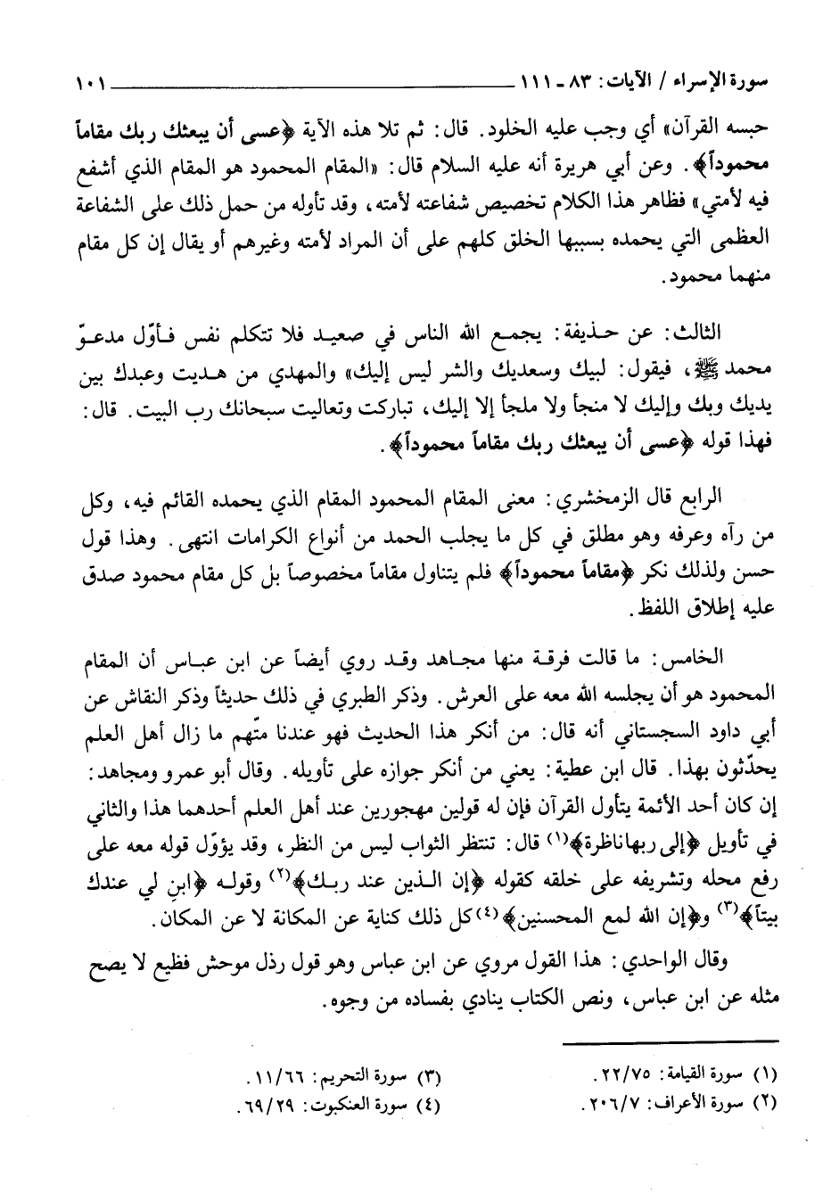 الرَّابِعُ قَالَ الزَّمَخْشَرِيُّ: مَعْنَى الْمَقَامِ الْمَحْمُودِ الْمُقَامُ الَّذِي يَحْمَدُهُ الْقَائِمُ فِيهِ، وَكُلُّ مَنْ رَآهُ وَعَرَفَهُ وَهُوَ مُطْلَقٌ فِي كُلِّ مَا يَجْلِبُ الْحَمْدَ مِنْ أَنْوَاعِ الْكَرَامَاتِ انْتَهَى. وَهَذَا قَوْلٌ حَسَنٌ وَلِذَلِكَ نَكَّرَ مَقاماً مَحْمُوداً فَلَمْ يَتَنَاوَلْ مَقَامًا مَخْصُوصًا بَلْ كُلُّ مَقَامٍ مَحْمُودٍ صَدَقَ عَلَيْهِ إِطْلَاقُ اللَّفْظِ.