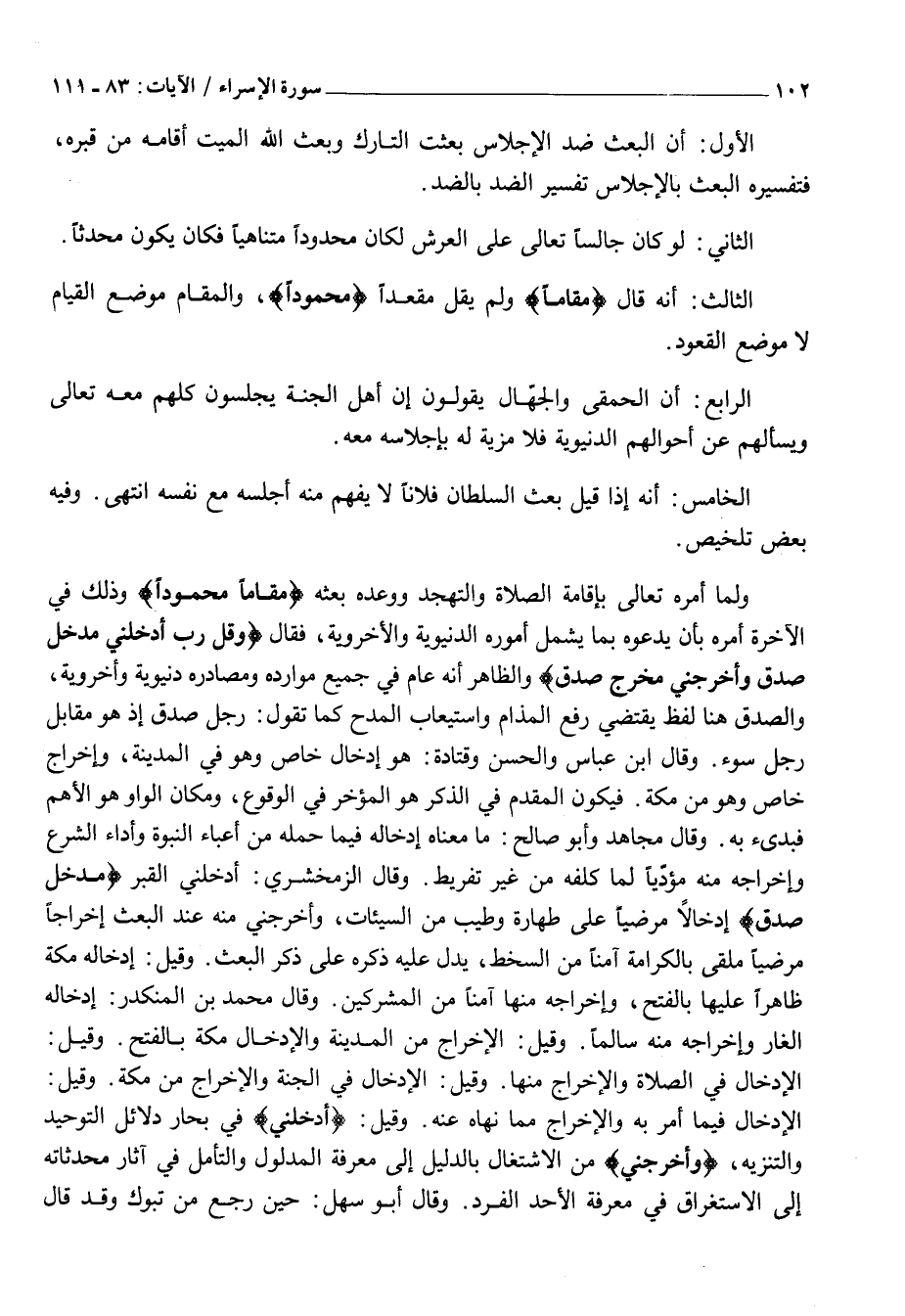 الثَّالِثُ: أَنَّهُ قَالَ مَقاماً وَلَمْ يَقُلْ مَقْعَدًا مَحْمُوداً، وَالْمَقَامُ مَوْضِعُ الْقِيَامِ لَا مَوْضِعُ الْقُعُودِ.