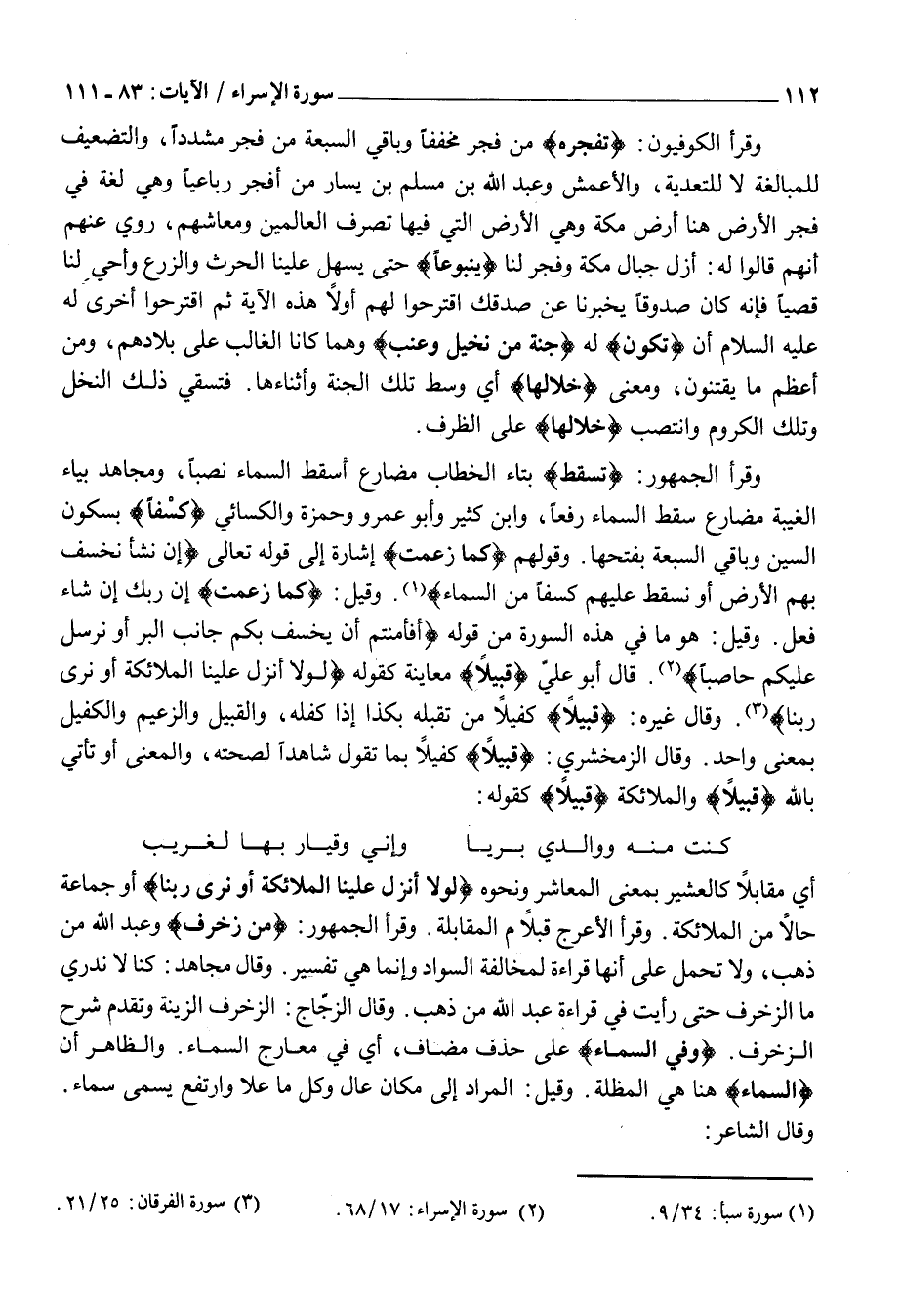 وَقَرَأَ الْجُمْهُورُ: تُسْقِطَ بِتَاءِ الْخِطَابِ مُضَارِعُ أَسْقَطَ السَّمَاءَ نَصْبًا، وَمُجَاهِدٌ بِيَاءِ الْغَيْبَةِ مُضَارِعُ سَقَطَ السَّمَاءُ رَفْعًا، وَابْنُ كَثِيرٍ وَأَبُو عَمْرٍو وَحَمْزَةُ وَالْكِسَائِيُّ كِسَفاً بِسُكُونِ السِّينِ وَبَاقِي السَّبْعَةِ بِفَتْحِهَا. وَقَوْلُهُمْ كَما زَعَمْتَ إِشَارَةٌ إِلَى قَوْلِهِ تَعَالَى إِنْ نَشَأْ نَخْسِفْ بِهِمُ الْأَرْضَ أَوْ نُسْقِطْ عَلَيْهِمْ كِسَفاً مِنَ السَّماءِ «1» . وَقِيلَ: كَما زَعَمْتَ إِنَّ رَبَّكَ إِنْ شَاءَ فَعَلَ. وَقِيلَ: هُوَ مَا فِي هَذِهِ السُّورَةِ مِنْ قوله أَفَأَمِنْتُمْ أَنْ يَخْسِفَ بِكُمْ جانِبَ الْبَرِّ أَوْ يُرْسِلَ عَلَيْكُمْ حاصِباً «2» . قَالَ أَبُو عَلِيٍّ قَبِيلًا مُعَايَنَةً كَقَوْلِهِ لَوْلا أُنْزِلَ عَلَيْنَا الْمَلائِكَةُ أَوْ نَرى رَبَّنا «3» . وَقَالَ غَيْرُهُ: قَبِيلًا كَفِيلًا مِنْ تقبله بكذا إذا كَفَلَهُ، وَالْقَبِيلُ وَالزَّعِيمُ وَالْكَفِيلُ بِمَعْنًى وَاحِدٍ. وَقَالَ الزَّمَخْشَرِيُّ: قَبِيلًا كَفِيلًا بِمَا تَقُولُ شَاهِدًا لِصِحَّتِهِ، وَالْمَعْنَى أَوْ تَأْتِي بِاللَّهِ قَبِيلًا وَالْمَلَائِكَةِ قَبِيلًا كَقَوْلِهِ: