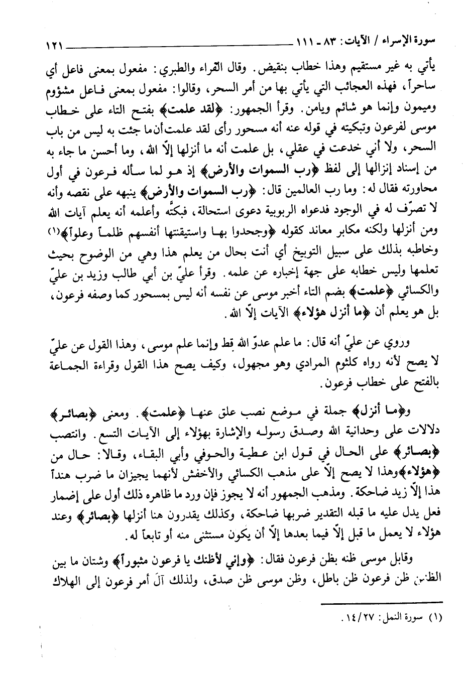 وَقَابَلَ مُوسَى ظَنَّهُ بِظَنِّ فِرْعَوْنَ فَقَالَ: وَإِنِّي لَأَظُنُّكَ يا فِرْعَوْنُ مَثْبُوراً وَشَتَّانَ مَا بَيْنَ الظَّنَّيْنِ ظَنُّ فِرْعَوْنَ ظَنٌّ بَاطِلٌ، وَظَنُّ مُوسَى ظَنُّ صِدْقٍ، وَلِذَلِكَ آلَ أَمْرُ فرعون إلى الهلاك