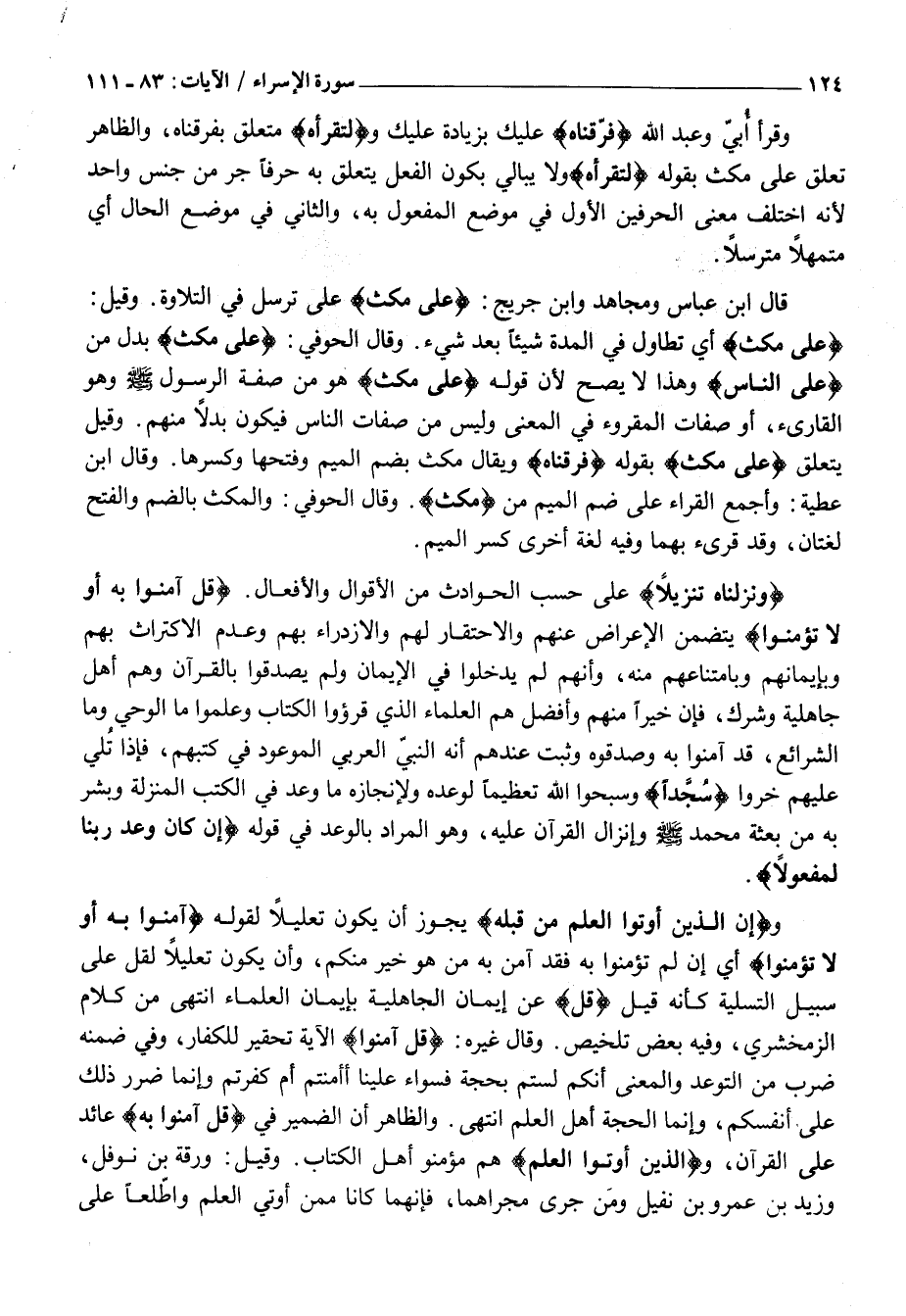 وَنَزَّلْناهُ تَنْزِيلًا عَلَى حَسَبِ الْحَوَادِثِ مِنَ الْأَقْوَالِ وَالْأَفْعَالِ. قُلْ آمِنُوا بِهِ أَوْ لَا تُؤْمِنُوا يَتَضَمَّنُ الْإِعْرَاضَ عَنْهُمْ وَالِاحْتِقَارَ لَهُمْ وَالِازْدِرَاءَ بِهِمْ وَعَدَمَ الِاكْتِرَاثِ بِهِمْ وَبِإِيمَانِهِمْ وَبِامْتِنَاعِهِمْ مِنْهُ، وَأَنَّهُمْ لَمْ يَدْخُلُوا فِي الْإِيمَانِ وَلَمْ يُصَدِّقُوا بِالْقُرْآنِ وَهُمْ أَهْلُ جَاهِلِيَّةٍ وَشِرْكٍ، فَإِنَّ خَيْرًا مِنْهُمْ وَأَفْضَلَ هُمُ الْعُلَمَاءُ الَّذِي قرؤوا الْكِتَابَ وَعَلِمُوا مَا الْوَحْيُ وَمَا الشَّرَائِعُ، قَدْ آمَنُوا بِهِ وَصَدَّقُوهُ وَثَبَتَ عِنْدَهُمْ أَنَّهُ النَّبِيُّ الْعَرَبِيُّ الْمَوْعُودُ فِي كُتُبِهِمْ، فَإِذَا تُلِيَ عَلَيْهِمْ خَرُّوا سُجَّداً وَسَبَّحُوا اللَّهَ تَعْظِيمًا لِوَعْدِهِ وَلِإِنْجَازِهِ مَا وَعَدَ فِي الْكُتُبِ الْمُنَزَّلَةِ وَبَشَّرَ بِهِ مِنْ بَعْثَةِ مُحَمَّدٍ صَلَّى اللَّهُ عَلَيْهِ وَسَلَّمَ وَإِنْزَالِ الْقُرْآنِ عَلَيْهِ، وَهُوَ الْمُرَادُ بِالْوَعْدِ فِي قَوْلِهِ إِنْ كانَ وَعْدُ رَبِّنا لَمَفْعُولًا.