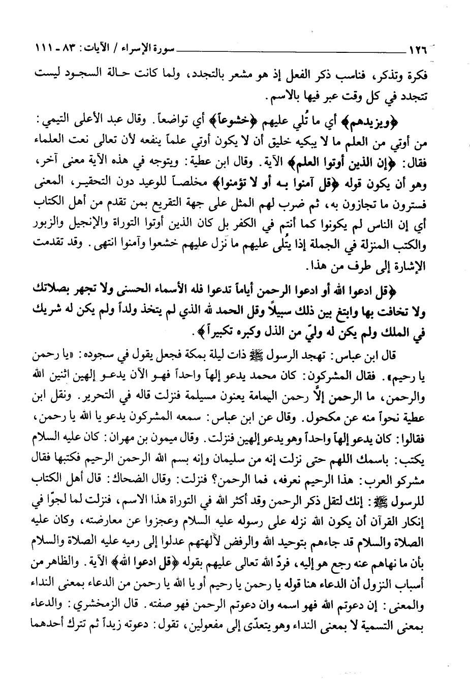 قُلِ ادْعُوا اللَّهَ أَوِ ادْعُوا الرَّحْمنَ أَيًّا مَا تَدْعُوا فَلَهُ الْأَسْماءُ الْحُسْنى وَلا تَجْهَرْ بِصَلاتِكَ وَلا تُخافِتْ بِها وَابْتَغِ بَيْنَ ذلِكَ سَبِيلًا وَقُلِ الْحَمْدُ لِلَّهِ الَّذِي لَمْ يَتَّخِذْ وَلَداً وَلَمْ يَكُنْ لَهُ شَرِيكٌ فِي الْمُلْكِ وَلَمْ يَكُنْ لَهُ وَلِيٌّ مِنَ الذُّلِّ وَكَبِّرْهُ تَكْبِيراً.