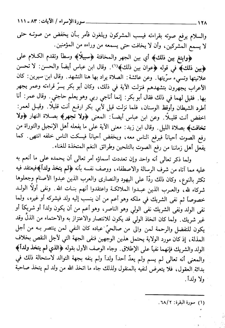 وَابْتَغِ بَيْنَ ذلِكَ أَيْ بَيْنَ الْجَهْرِ وَالْمُخَافَتَةِ سَبِيلًا وَسَطًا وَتَقَدَّمَ الْكَلَامُ عَلَى بَيْنَ ذلِكَ فِي قَوْلِهِ عَوانٌ بَيْنَ ذلِكَ «1» . وَقَالَ ابْنُ عَبَّاسٍ أَيْضًا وَالْحَسَنُ: لَا تُحَسِّنُ عَلَانِيَتَهَا وَتُسِيءُ سِرِّيَّتَهَا. وَعَنْ عَائِشَةَ: الصَّلَاةُ يُرَادُ بِهَا هُنَا التَّشَهُّدُ. وَقَالَ ابْنُ سِيرِينَ: كَانَ الْأَعْرَابُ يَجْهَرُونَ بِتَشَهُّدِهِمْ فَنَزَلَتِ الْآيَةُ فِي ذَلِكَ، وَكَانَ أَبُو بَكْرٍ يُسِرُّ قراءته وعمر يَجْهَرُ بِهَا. فَقِيلَ لَهُمَا فِي ذَلِكَ فَقَالَ أَبُو بَكْرٍ: إِنَّمَا أُنَاجِي رَبِّي وَهُوَ يَعْلَمُ حَاجَتِي. وَقَالَ عُمَرُ: أَنَا أَطْرُدُ الشَّيْطَانَ وَأُوقِظُ الْوَسَنَانَ، فَلَمَّا نَزَلَتْ قِيلَ لِأَبِي بَكْرٍ ارْفَعْ أَنْتَ قَلِيلًا. وَقِيلَ لِعُمَرَ: