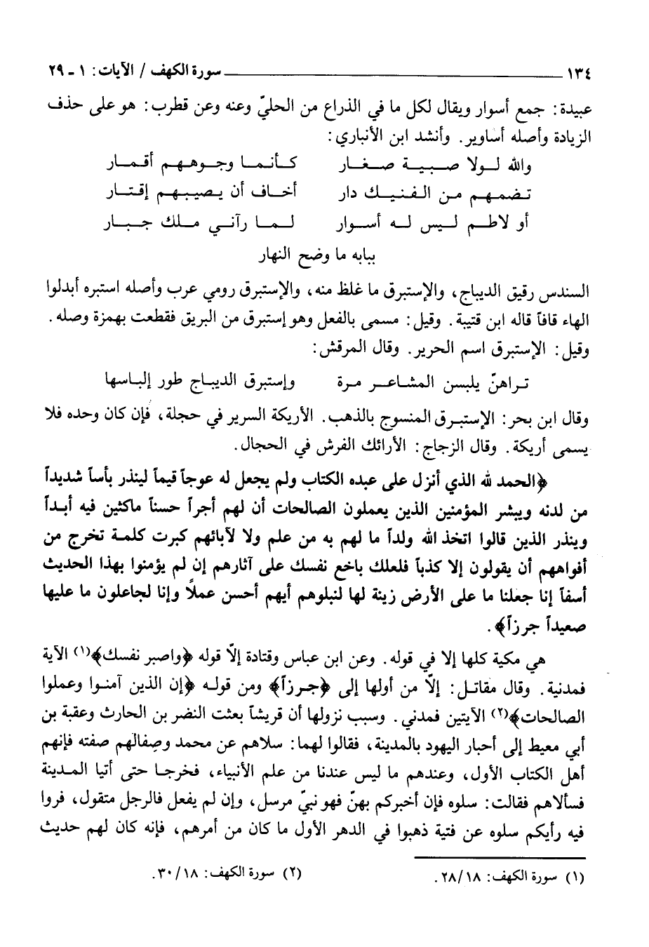 الْحَمْدُ لِلَّهِ الَّذِي أَنْزَلَ عَلى عَبْدِهِ الْكِتابَ وَلَمْ يَجْعَلْ لَهُ عِوَجاً قَيِّماً لِيُنْذِرَ بَأْساً شَدِيداً مِنْ لَدُنْهُ وَيُبَشِّرَ الْمُؤْمِنِينَ الَّذِينَ يَعْمَلُونَ الصَّالِحاتِ أَنَّ لَهُمْ أَجْراً حَسَناً ماكِثِينَ فِيهِ أَبَداً وَيُنْذِرَ الَّذِينَ قالُوا اتَّخَذَ اللَّهُ وَلَداً مَا لَهُمْ بِهِ مِنْ عِلْمٍ وَلا لِآبائِهِمْ كَبُرَتْ كَلِمَةً تَخْرُجُ مِنْ أَفْواهِهِمْ إِنْ يَقُولُونَ إِلَّا كَذِباً فَلَعَلَّكَ باخِعٌ نَفْسَكَ عَلى آثارِهِمْ إِنْ لَمْ يُؤْمِنُوا بِهذَا الْحَدِيثِ أَسَفاً إِنَّا جَعَلْنا مَا عَلَى الْأَرْضِ زِينَةً لَها لِنَبْلُوَهُمْ أَيُّهُمْ أَحْسَنُ عَمَلًا وَإِنَّا لَجاعِلُونَ مَا عَلَيْها صَعِيداً جُرُزاً.