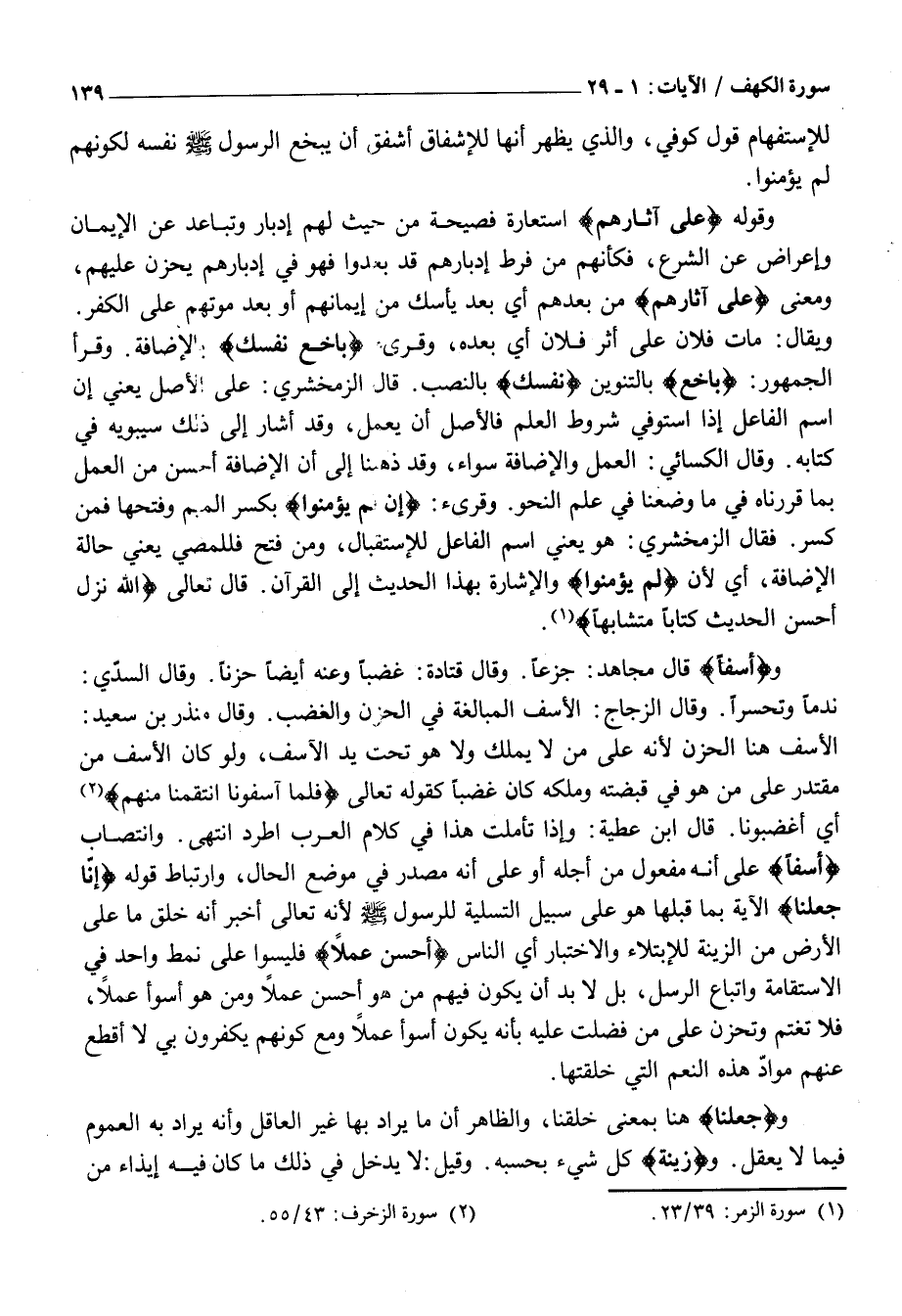 الْأَسَفُ هُنَا الْحُزْنُ لِأَنَّهُ عَلَى مَنْ لَا يَمْلِكُ وَلَا هُوَ تَحْتَ يَدِ الْآسِفِ، وَلَوْ كَانَ الْأَسَفُ مِنْ مُقْتَدِرٍ عَلَى مَنْ هُوَ فِي قَبْضَتِهِ وَمِلْكِهِ كَانَ غَضَبًا كَقَوْلِهِ تَعَالَى فَلَمَّا آسَفُونا انْتَقَمْنا مِنْهُمْ «2» أَيْ أَغْضَبُونَا. قَالَ ابْنُ عَطِيَّةَ: وَإِذَا تَأَمَّلْتَ هَذَا فِي كَلَامِ الْعَرَبِ اطَّرَدَ انْتَهَى. وَانْتِصَابُ أَسَفاً عَلَى أَنَّهُ مَفْعُولٌ مِنْ أَجْلِهِ أَوْ عَلَى أَنَّهُ مَصْدَرٌ فِي مَوْضِعِ الْحَالِ، وَارْتِبَاطُ قَوْلِهِ إِنَّا جَعَلْنا الْآيَةِ بِمَا قَبْلَهَا هُوَ عَلَى سَبِيلِ التَّسْلِيَةِ لِلرَّسُولِ صَلَّى اللَّهُ عَلَيْهِ وَسَلَّمَ لِأَنَّهُ تَعَالَى أَخْبَرَ أَنَّهُ خَلَقَ مَا عَلَى الْأَرْضِ مِنَ الزِّينَةِ لِلِابْتِلَاءِ وَالِاخْتِبَارِ أَيُّ النَّاسِ أَحْسَنُ عَمَلًا فَلَيْسُوا عَلَى نَمَطٍ وَاحِدٍ فِي الِاسْتِقَامَةِ وَاتِّبَاعِ الرُّسُلِ، بَلْ لَا بُدَّ أَنْ يَكُونَ فِيهِمْ مَنْ هُوَ أَحْسَنُ عَمَلًا وَمَنْ هُوَ أَسْوَأُ عَمَلًا، فَلَا تَغْتَمَّ وَتَحْزَنْ عَلَى مَنْ فُضِّلْتَ عَلَيْهِ بِأَنَّهُ يَكُونُ أَسْوَأَ عَمَلًا وَمَعَ كَوْنِهِمْ يَكْفُرُونَ بِي لَا أَقْطَعُ عَنْهُمْ مَوَادَّ هَذِهِ النِّعَمِ الَّتِي خَلَقْتُهَا.
