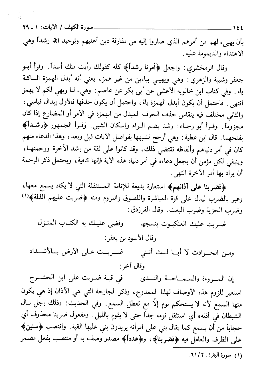 فَضَرَبْنا عَلَى آذانِهِمْ اسْتِعَارَةٌ بَدِيعَةٌ لِلْإِنَامَةِ الْمُسْتَثْقَلَةِ الَّتِي لَا يَكَادُ يُسْمَعُ مَعَهَا، وَعَبَّرَ بِالضَّرْبِ لِيَدُلَّ عَلَى قُوَّةِ الْمُبَاشَرَةِ وَاللُّصُوقِ وَاللُّزُومِ وَمِنْهُ ضُرِبَتْ عَلَيْهِمُ الذِّلَّةُ «1» وَضُرِبَ الْجِزْيَةِ وَضَرْبُ الْبَعْثِ. وَقَالَ الْفَرَزْدَقِ: