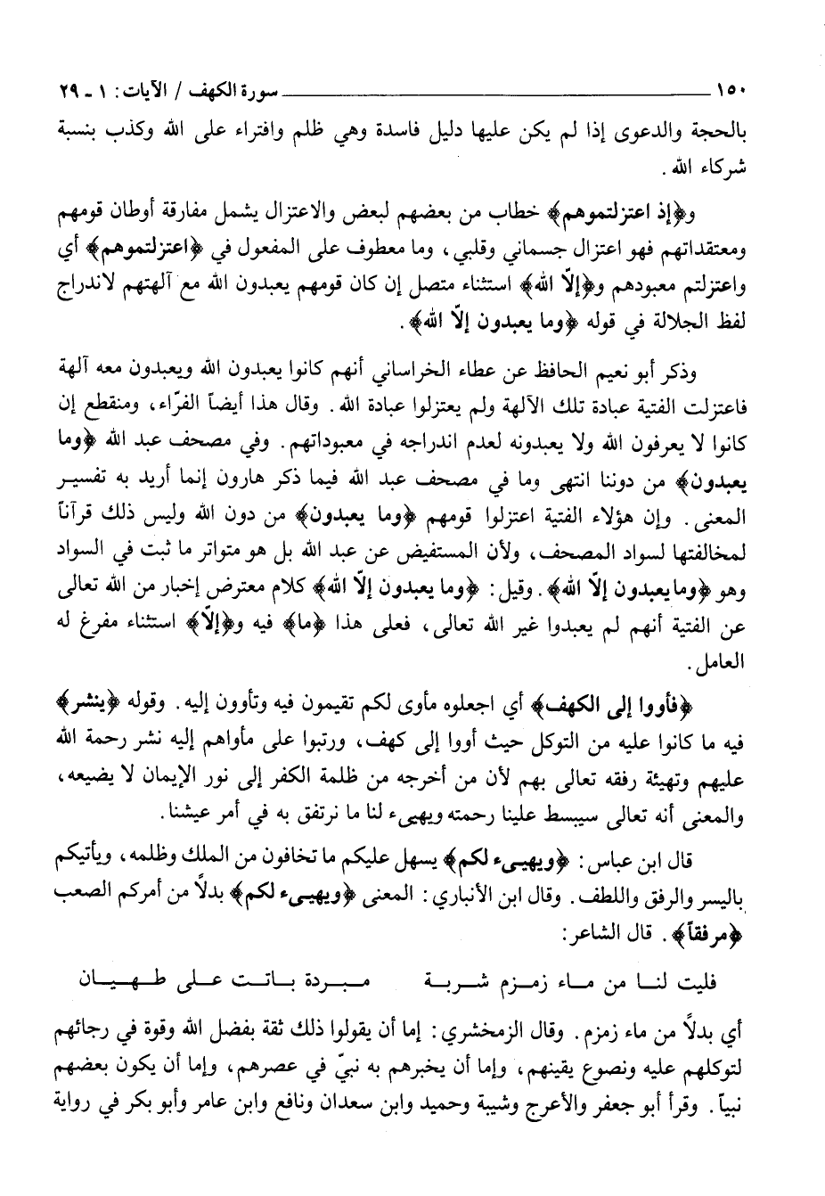وَذَكَرَ أَبُو نُعَيْمٍ الْحَافِظُ عَنْ عَطَاءٍ الْخُرَاسَانِيِّ أَنَّهُمْ كَانُوا يَعْبُدُونَ اللَّهَ وَيَعْبُدُونَ مَعَهُ آلِهَةً فَاعْتَزَلَتِ الْفِتْيَةُ عِبَادَةَ تِلْكَ الْآلِهَةِ وَلَمْ يَعْتَزِلُوا عِبَادَةَ اللَّهِ. وَقَالَ هَذَا أَيْضًا الْفَرَّاءُ، وَمُنْقَطِعٌ إِنْ كَانُوا لَا يَعْرِفُونَ اللَّهَ وَلَا يَعْبُدُونَهُ لِعَدَمِ انْدِرَاجِهِ فِي مَعْبُودَاتِهِمْ. وَفِي مُصْحَفِ عَبْدِ اللَّهِ وَما يَعْبُدُونَ مِنْ دُونِنَا انْتَهَى وَمَا فِي مُصْحَفِ عَبْدِ اللَّهِ فِيمَا ذَكَرَ هَارُونُ إِنَّمَا أُرِيدَ بِهِ تَفْسِيرُ الْمَعْنَى. وَإِنَّ هَؤُلَاءِ الْفِتْيَةَ اعْتَزَلُوا قَوْمَهُمْ وَما يَعْبُدُونَ مِنْ دُونِ اللَّهِ وَلَيْسَ ذَلِكَ قُرْآنًا لِمُخَالَفَتِهَا لِسَوَادِ الْمُصْحَفِ، وَلِأَنَّ الْمُسْتَفِيضَ عَنْ عَبْدِ اللَّهِ بَلْ هُوَ مُتَوَاتِرٌ مَا ثَبَتَ فِي السَّوَادِ وهو وَما يَعْبُدُونَ إِلَّا اللَّهَ. وَقِيلَ: وَما يَعْبُدُونَ إِلَّا اللَّهَ كَلَامٌ مُعْتَرَضٌ إِخْبَارٌ مِنَ اللَّهِ تَعَالَى عن الْفِتْيَةِ أَنَّهُمْ لَمْ يَعْبُدُوا غَيْرَ اللَّهِ تَعَالَى، فَعَلَى هَذَا ما فيه وإِلَّا اسْتِثْنَاءٌ مُفَرَّغٌ لَهُ الْعَامِلُ.