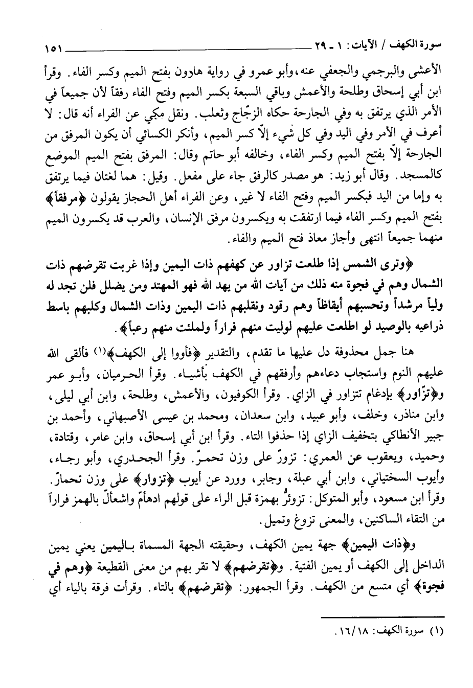 وذاتَ الْيَمِينِ جِهَةَ يَمِينِ الْكَهْفِ، وَحَقِيقَتُهُ الْجِهَةُ الْمُسَمَّاةُ بِالْيَمِينِ يَعْنِي يَمِينَ الدَّاخِلِ إِلَى الْكَهْفِ أَوْ يَمِينَ الْفِتْيَةِ. وتَقْرِضُهُمْ لَا تَقْرَبُهُمْ مِنْ مَعْنَى الْقَطِيعَةِ وَهُمْ فِي فَجْوَةٍ أَيْ مُتَّسَعٌ مِنَ الْكَهْفِ. وَقَرَأَ الْجُمْهُورُ: تَقْرِضُهُمْ بِالتَّاءِ. وَقَرَأَتْ فِرْقَةٌ بِالْيَاءِ أَيْ