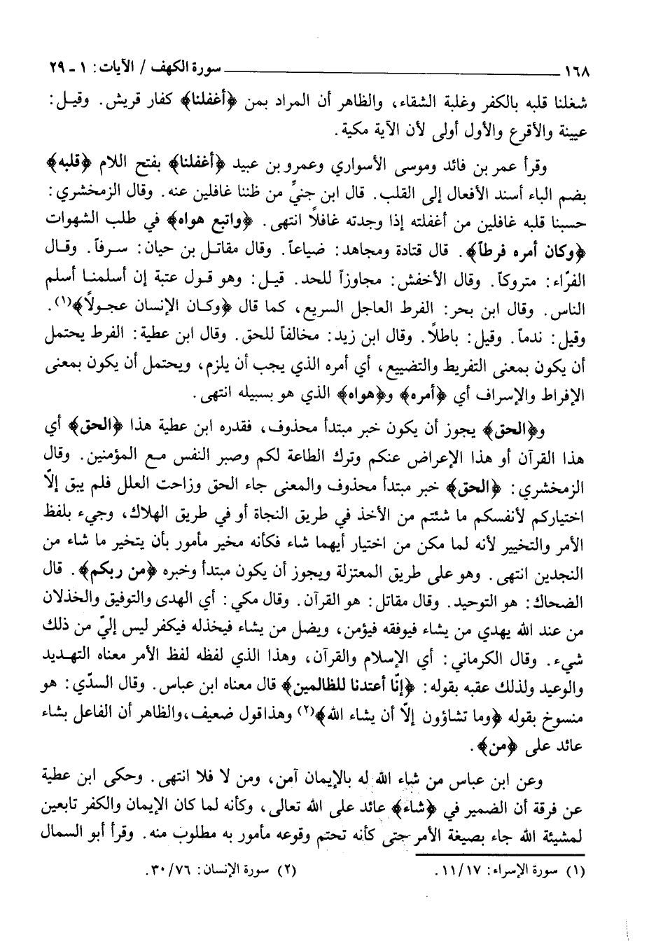 حَسِبْنَا قَلْبَهُ غَافِلِينَ مِنْ أَغْفَلْتُهُ إِذَا وَجَدْتُهُ غَافِلًا انْتَهَى. وَاتَّبَعَ هَواهُ فِي طَلَبِ الشَّهَوَاتِ وَكانَ أَمْرُهُ فُرُطاً. قَالَ قَتَادَةُ وَمُجَاهِدٌ: ضَيَاعًا. وَقَالَ مُقَاتِلُ بْنُ حَيَّانَ: سَرَفًا. وَقَالَ الْفَرَّاءُ: مَتْرُوكًا. وَقَالَ الْأَخْفَشُ: مُجَاوِزًا لِلْحَدِّ. قِيلَ: وَهُوَ قَوْلُ عُتْبَةَ إِنْ أَسْلَمْنَا أَسْلَمَ النَّاسُ. وَقَالَ ابْنُ بَحْرٍ: الْفَرَطُ الْعَاجِلُ السَّرِيعُ، كَمَا قَالَ وَكانَ الْإِنْسانُ عَجُولًا «1» .