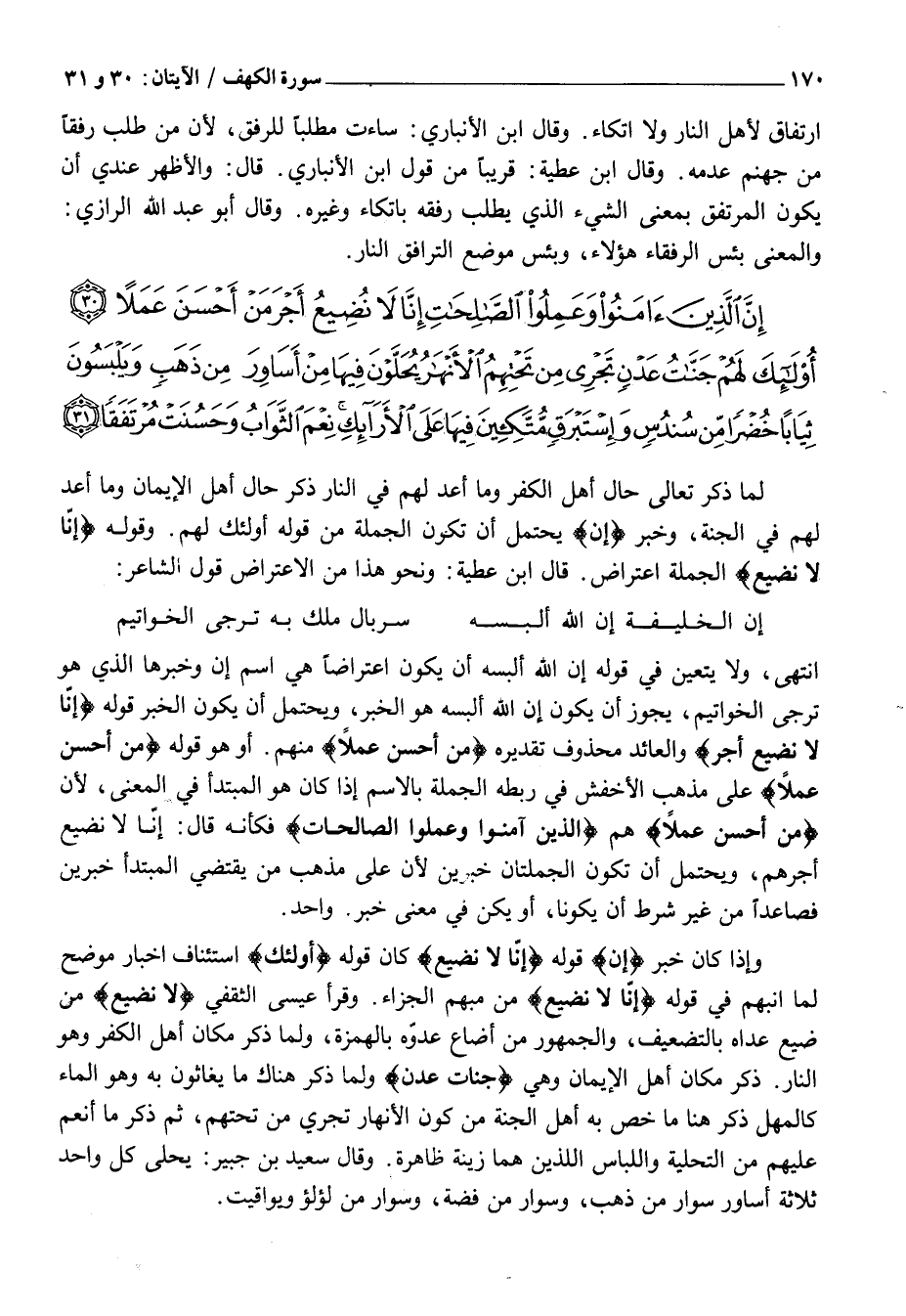 إِنَّ الَّذِينَ آمَنُوا وَعَمِلُوا الصَّالِحاتِ إِنَّا لَا نُضِيعُ أَجْرَ مَنْ أَحْسَنَ عَمَلاً (30) أُولئِكَ لَهُمْ جَنَّاتُ عَدْنٍ تَجْرِي مِنْ تَحْتِهِمُ الْأَنْهارُ يُحَلَّوْنَ فِيها مِنْ أَساوِرَ مِنْ ذَهَبٍ وَيَلْبَسُونَ ثِياباً خُضْراً مِنْ سُنْدُسٍ وَإِسْتَبْرَقٍ مُتَّكِئِينَ فِيها عَلَى الْأَرائِكِ نِعْمَ الثَّوابُ وَحَسُنَتْ مُرْتَفَقاً (31)