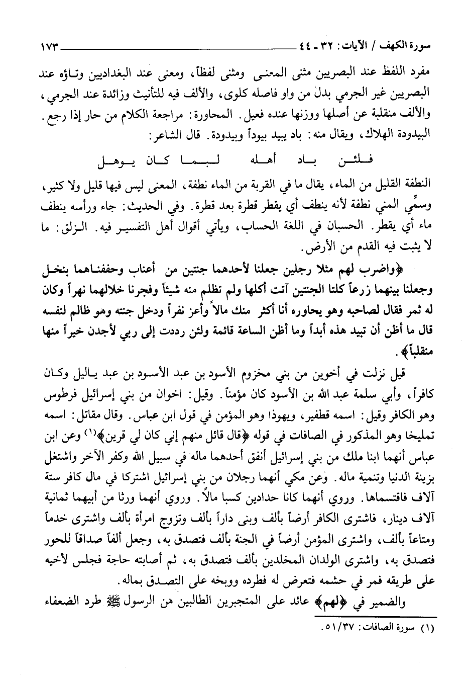 وَاضْرِبْ لَهُمْ مَثَلًا رَجُلَيْنِ جَعَلْنا لِأَحَدِهِما جَنَّتَيْنِ مِنْ أَعْنابٍ وَحَفَفْناهُما بِنَخْلٍ وَجَعَلْنا بَيْنَهُما زَرْعاً كِلْتَا الْجَنَّتَيْنِ آتَتْ أُكُلَها وَلَمْ تَظْلِمْ مِنْهُ شَيْئاً وَفَجَّرْنا خِلالَهُما نَهَراً وَكانَ لَهُ ثَمَرٌ فَقالَ لِصاحِبِهِ وَهُوَ يُحاوِرُهُ أَنَا أَكْثَرُ مِنْكَ مَالًا وَأَعَزُّ نَفَراً وَدَخَلَ جَنَّتَهُ وَهُوَ ظالِمٌ لِنَفْسِهِ قالَ مَا أَظُنُّ أَنْ تَبِيدَ هذِهِ أَبَداً وَما أَظُنُّ السَّاعَةَ قائِمَةً وَلَئِنْ رُدِدْتُ إِلى رَبِّي لَأَجِدَنَّ خَيْراً مِنْها مُنْقَلَباً.