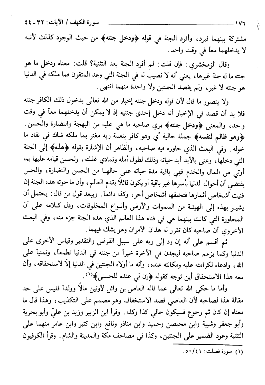 وَأَمَّا مَا حَكَى اللَّهُ تَعَالَى عَمَّا قَالَهُ الْعَاصُ بْنُ وَائِلٍ لَأُوتَيَنَّ مَالًا وَوَلَدًا فَلَيْسَ عَلَى حَدِّ مَقَالَةِ هَذَا لِصَاحِبِهِ لِأَنَّ الْعَاصِيَ قَصَدَ الِاسْتِخْفَافَ وَهُوَ مُصَمِّمٌ عَلَى التَّكْذِيبِ، وَهَذَا قَالَ مَا مَعْنَاهُ إِنْ كَانَ ثَمَّ رُجُوعٌ فَسَيَكُونُ حَالِي كَذَا وَكَذَا. وَقَرَأَ ابْنُ الزُّبَيْرِ وَزَيْدُ بْنُ عَلِيٍّ وَأَبُو بَحْرِيَّةَ وَأَبُو جَعْفَرٍ وَشَيْبَةُ وَابْنُ مُحَيْصِنٍ وَحُمَيْدٌ وَابْنُ مُنَاذِرٍ وَنَافِعٌ وَابْنُ كَثِيرٍ وَابْنُ عَامِرٍ مِنْهُمَا عَلَى التَّثْنِيَةِ وَعَوْدِ الضَّمِيرِ عَلَى الْجَنَّتَيْنِ، وَكَذَا فِي مَصَاحِفِ مَكَّةَ وَالْمَدِينَةِ وَالشَّامِ. وَقَرَأَ الْكُوفِيُّونَ