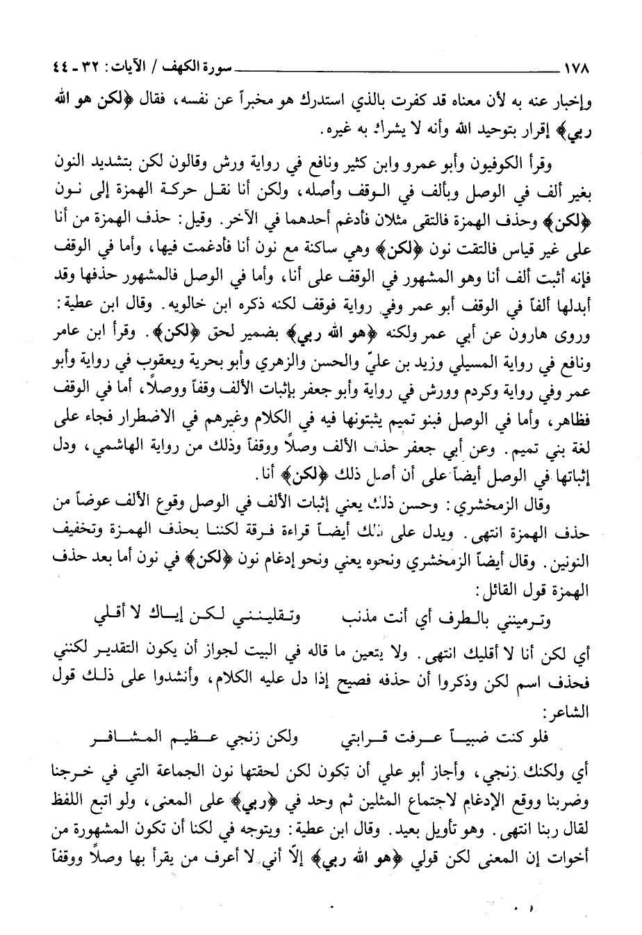 أَيْ وَلَكِنَّكَ زِنْجِيٌّ، وَأَجَازَ أَبُو عَلِيٍّ أَنْ تَكُونَ لَكِنْ لَحِقَتْهَا نُونُ الْجَمَاعَةِ الَّتِي فِي خَرَجْنَا وَضَرَبْنَا وَوَقَعَ الْإِدْغَامُ لِاجْتِمَاعِ الْمِثْلَيْنِ ثُمَّ وَحَّدَ فِي رَبِّي عَلَى الْمَعْنَى، وَلَوِ اتَّبَعَ اللَّفْظَ لَقَالَ رَبَّنَا انْتَهَى. وَهُوَ تَأْوِيلٌ بِعِيدٌ. وَقَالَ ابْنُ عَطِيَّةَ: وَيَتَوَجَّهُ فِي لَكِنَّا أَنْ تَكُونَ الْمَشْهُورَةَ مِنْ أَخَوَاتِ إِنَّ الْمَعْنَى لَكِنَّ قَوْلِي هُوَ اللَّهُ رَبِّي إِلَّا أَنِّي لَا أَعْرِفُ مَنْ يَقْرَأُ بِهَا وَصْلًا وَوَقْفًا