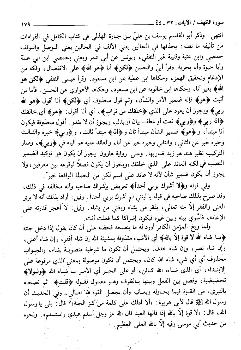 انْتَهَى. وَذَكَرَ أَبُو الْقَاسِمِ يُوسُف بْنِ عَلِيِّ بْنِ جُبَارَةَ الْهُذَلِيُّ فِي كِتَابِ الْكَامِلِ فِي الْقِرَاءَاتِ مِنْ تأليفه ما نصه: يحذفها فِي الْحَالَيْنِ يَعْنِي الْأَلِفَ فِي الْحَالَيْنِ يَعْنِي الْوَصْلَ وَالْوَقْفَ حِمْصِيٌّ وَابْنُ عُتْبَةَ وَقُتَيْبَةُ غَيْرُ الثَّقَفِيِّ، وَيُونُسُ عَنْ أَبِي عُمَرَ وَيَعْنِي بِحِمْصِيٍّ ابْنَ أَبِي عَبْلَةَ وَأَبَا حَيْوَةَ وَأَبَا بَحْرِيَّةَ. وقرأ أُبَيٌّ وَالْحَسَنُ لَكِنِ أَنَا هُوَ اللَّهُ عَلَى الِانْفِصَالِ، وَفَكِّهِ مِنَ الْإِدْغَامِ وَتَحْقِيقِ الْهَمْزِ، وَحَكَاهَا ابْنُ عَطِيَّةَ عَنِ ابْنِ مَسْعُودٍ. وَقَرَأَ عِيسَى الثَّقَفِيُّ لَكِنَّ هُوَ اللَّهُ بِغَيْرِ أَنَا، وَحَكَاهَا ابْنُ خَالَوَيْهِ عَنِ ابْنِ مَسْعُودٍ، وَحَكَاهَا الْأَهْوَازِيُّ عَنِ الْحَسَنِ. فَأَمَّا مَنْ أَثْبَتَ هُوَ فَإِنَّهُ ضَمِيرُ الْأَمْرِ وَالشَّأْنِ، وَثَمَّ قَوْلٌ مَحْذُوفٌ أَيْ لَكِنْ أَنَا أَقُولُ هُوَ اللَّهُ رَبِّي وَيَجُوزُ أَنْ يَعُودَ عَلَى الَّذِي خَلَقَكَ مِنْ تُرابٍ، أَيْ أَنَا أَقُولُ: هُوَ أَيْ خالقك اللَّهُ رَبِّي ورَبِّي نَعْتٌ أَوْ عَطْفُ بَيَانٍ أَوْ بَدَلٌ، وَيَجُوزُ أَنْ لَا يُقَدَّرَ. أَقُولُ مَحْذُوفَةً فيكون أنا مبتدأ، وهُوَ ضَمِيرُ الشَّأْنِ مُبْتَدَأٌ ثَانٍ واللَّهُ مبتدأ ثالث، ورَبِّي خبره والثالث وخبره خَبَرٌ عَنِ الثَّانِي، وَالثَّانِي وَخَبَرُهُ خَبَرٌ عَنْ أَنَا، وَالْعَائِدُ عَلَيْهِ هُوَ الْيَاءُ فِي رَبِّي، وَصَارَ التَّرْكِيبُ نَظِيرَ هِنْدٌ هُوَ زَيْدٌ ضَارِبُهَا. وَعَلَى رِوَايَةِ هَارُونَ يَجُوزُ أَنْ يَكُونَ هُوَ توكيد الضمير النَّصْبِ فِي لَكِنَّهُ الْعَائِدُ عَلَى الَّذِي خَلَقَكَ، وَيَجُوزُ أَنْ يَكُونَ فَصْلًا لِوُقُوعِهِ بَيْنَ مُعَرَّفَيْنِ، وَلَا يَجُوزُ أَنْ يَكُونَ ضَمِيرَ شَأْنٍ لِأَنَّهُ لَا عَائِدَ عَلَى اسْمِ لَكِنَّ مِنَ الْجُمْلَةِ الْوَاقِعَةِ خَبَرًا.
