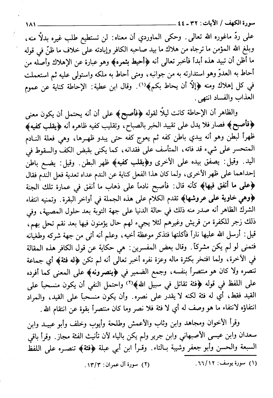 وَالظَّاهِرُ أَنَّ الْإِحَاطَةَ كَانَتْ لَيْلًا لِقَوْلِهِ فَأَصْبَحَ عَلَى أَنَّ أَنَّهُ يُحْتَمَلُ أَنْ يَكُونَ مَعْنَى فَأَصْبَحَ فَصَارَ فَلَا يَدُلُّ عَلَى تَقْيِيدِ الْخَبَرِ بِالصَّبَاحِ، وَتَقْلِيبُ كَفَّيْهِ ظَاهِرُهُ أَنَّهُ يُقَلِّبُ كَفَّيْهِ ظَهْرًا لِبَطْنٍ وَهُوَ أَنَّهُ يُبْدِي بَاطِنَ كَفِّهِ ثُمَّ يُعْوِجُ كَفَّهُ حَتَّى يَبْدُوَ ظَهْرُهَا، وَهِيَ فِعْلَةُ النَّادِمِ الْمُتَحَسِّرِ عَلَى شَيْءٍ قَدْ فَاتَهُ، الْمُتَأَسِّفِ عَلَى فِقْدَانِهِ، كَمَا يُكَنَّى بِقَبْضِ الْكَفِّ وَالسُّقُوطِ فِي الْيَدِ. وَقِيلَ: يُصَفِّقُ بِيَدِهِ عَلَى الأخرى ويُقَلِّبُ كَفَّيْهِ ظهر البطن. وَقِيلَ: يَضَعُ بَاطِنَ إِحْدَاهُمَا عَلَى ظَهْرِ الْأُخْرَى، وَلَمَّا كَانَ هَذَا الْفِعْلُ كِنَايَةً عَنِ النَّدَمِ عَدَّاهُ تَعْدِيَةَ فِعْلِ النَّدَمِ فَقَالَ عَلى مَا أَنْفَقَ فِيها كَأَنَّهُ قَالَ: فَأَصْبَحَ نَادِمًا عَلَى ذَهَابِ مَا أَنْفَقَ فِي عِمَارَةِ تِلْكَ الْجَنَّةِ وَهِيَ خاوِيَةٌ عَلى عُرُوشِها تَقَدَّمَ الْكَلَامُ عَلَى هَذِهِ الْجُمْلَةِ فِي أَوَاخِرِ الْبَقَرَةِ. وَتَمَنِّيهِ انْتِفَاءَ الشِّرْكِ الظَّاهِرُ أَنَّهُ صَدَرَ مِنْهُ ذَلِكَ فِي حَالَةِ الدُّنْيَا عَلَى جِهَةِ التَّوْبَةِ بَعْدَ حُلُولِ الْمُصِيبَةِ، وَفِي ذَلِكَ زَجْرٌ لِلْكَفَرَةِ مِنْ قُرَيْشٍ وَغَيْرِهِمْ لِئَلَّا يَجِيءَ لَهُمْ حَالٌ يُؤْمِنُونَ فِيهَا بَعْدَ نِقَمٍ تَحُلُّ بِهِمْ، قِيلَ: أَرْسَلَ اللَّهُ عَلَيْهَا نَارًا فَأَكَلَتْهَا فَتَذَكَّرَ مَوْعِظَةَ أَخِيهِ، وَعَلِمَ أَنَّهُ أُتِيَ مِنْ جِهَةِ شِرْكِهِ وَطُغْيَانِهِ فَتَمَنَّى لَوْ لَمْ يَكُنْ مُشْرِكًا. وَقَالَ بَعْضُ الْمُفَسِّرِينَ: هِيَ حِكَايَةٌ عَنْ قَوْلِ الْكَافِرِ هَذِهِ الْمَقَالَةَ فِي الْآخِرَةِ، وَلَمَّا افْتَخَرَ بِكَثْرَةِ مَالِهِ وَعَزَّةِ نَفَرِهِ أَخْبَرَ تَعَالَى أَنَّهُ لَمْ تَكُنْ لَهُ فِئَةٌ أَيْ جَمَاعَةٌ تَنْصُرُهُ وَلَا كَانَ هُوَ مُنْتَصِرًا بِنَفْسِهِ، وَجَمَعَ الضَّمِيرَ فِي يَنْصُرُونَهُ عَلَى الْمَعْنَى كَمَا أَفْرَدَهُ عَلَى اللَّفْظِ فِي قَوْلِهِ فِئَةٌ تُقاتِلُ فِي سَبِيلِ اللَّهِ «2» وَاحْتُمِلَ النَّفْيُ أَنْ يَكُونَ مُنْسَحِبًا عَلَى الْقَيْدِ فَقَطْ، أَيْ لَهُ فِئَةٌ لَكِنَّهُ لَا يَقْدِرُ عَلَى نَصْرِهِ. وَأَنْ يَكُونَ مُنْسَحِبًا عَلَى الْقَيْدِ، وَالْمُرَادُ انْتِفَاؤُهُ لِانْتِفَاءِ مَا هُوَ وَصْفٌ لَهُ أَيْ لَا فِئَةَ فَلَا نَصْرَ وَمَا كَانَ مُنْتَصِرًا بِقُوَّةٍ عَنِ انْتِقَامِ اللَّهِ.
