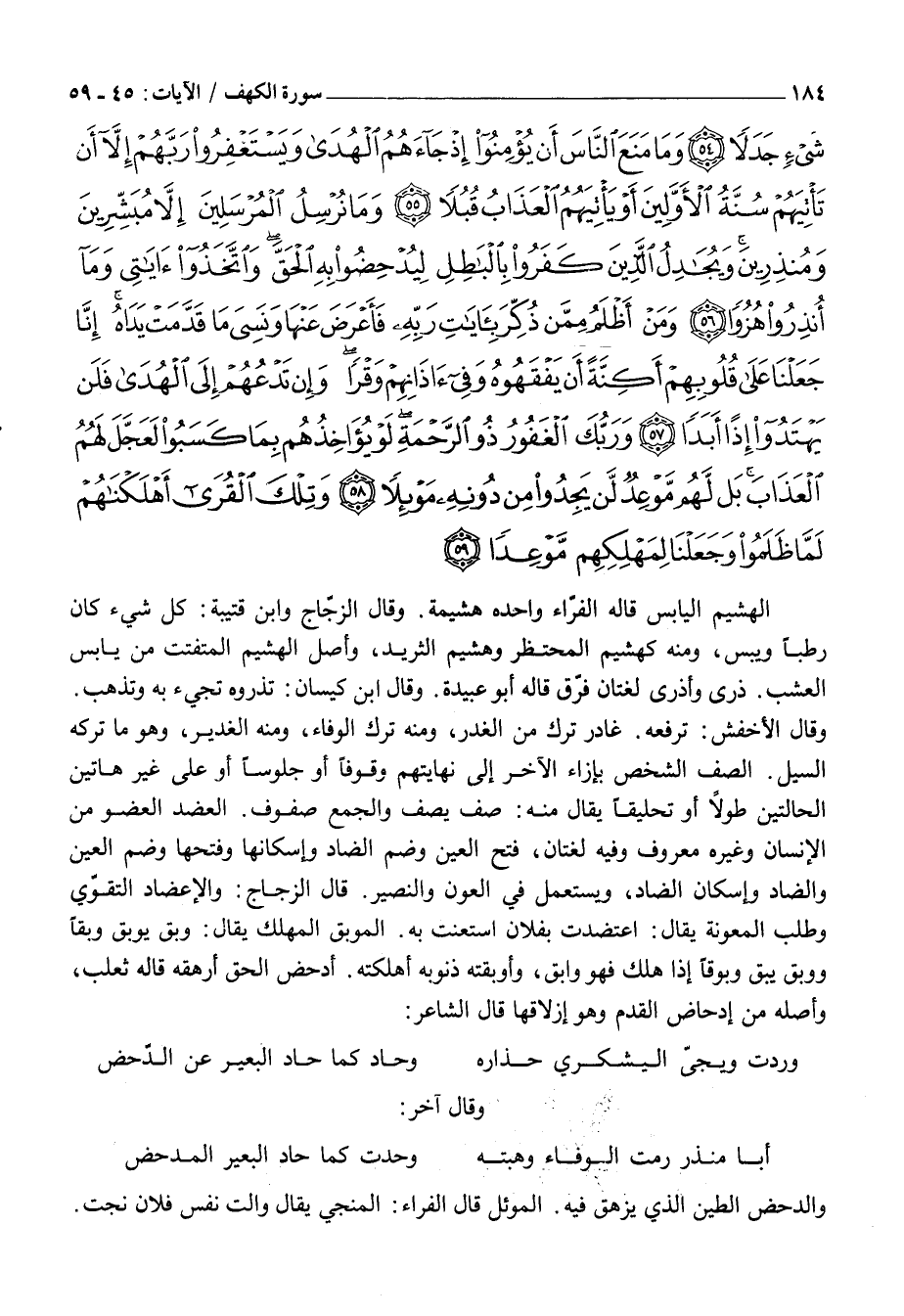 وَقَالَ الْأَخْفَشُ: تَرْفَعُهُ. غَادَرَ ترك من الغدر، ومنه تَرْكُ الْوَفَاءِ، وَمِنْهُ الْغَدِيرُ، وَهُوَ مَا تَرَكَهُ السَّيْلُ. الصَّفُّ الشَّخْصُ بِإِزَاءِ الْآخَرِ إِلَى نِهَايَتِهِمْ وُقُوفًا أَوْ جُلُوسًا أَوْ عَلَى غَيْرِ هَاتَيْنِ الْحَالَتَيْنِ طُولًا أَوْ تَحْلِيقًا يُقَالُ مِنْهُ: صَفَّ يَصُفُّ وَالْجَمْعُ صُفُوفٌ. الْعَضُدُ الْعُضْوُ مِنَ الْإِنْسَانِ وَغَيْرِهِ مَعْرُوفٌ وَفِيهِ لُغَتَانِ، فَتْحُ الْعَيْنِ وَضَمُّ الضَّادِ وَإِسْكَانُهَا وَفَتْحُهَا وَضَمُّ الْعَيْنِ وَالضَّادِ وَإِسْكَانُ الضَّادِ، وَيُسْتَعْمَلُ فِي الْعَوْنِ وَالنَّصِيرِ. قَالَ الزَّجَّاجُ: وَالْإِعْضَادُ التَّقَوِّي وَطَلَبُ الْمَعُونَةِ يُقَالُ: اعْتَضَدْتُ بِفُلَانٍ اسْتَعَنْتُ بِهِ. الْمَوْبِقُ الْمَهْلِكُ يُقَالُ: وَبِقَ يَوْبَقُ وَبَقًا وَوَبَقَ يَبِقُ وُبُوقًا إِذَا هَلَكَ فَهُوَ وَابِقٌ، وَأَوْبَقَتْهُ ذُنُوبُهُ أَهْلَكَتْهُ. أَدْحَضَ الْحَقُّ أَرْهَقَهُ قَالَهُ ثَعْلَبٌ، وَأَصْلُهُ مِنْ إِدْحَاضِ الْقَدَمِ وَهُوَ إِزْلَاقُهَا قَالَ الشَّاعِرُ: