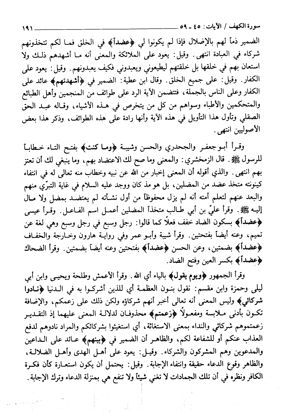 الضَّمِيرِ ذَمًّا لَهُمْ بِالْإِضْلَالِ فَإِذَا لَمْ يَكُونُوا لِي عَضُداً فِي الْخَلْقِ فَمَا لَكُمْ تَتَّخِذُونَهُمْ شُرَكَاءَ فِي الْعِبَادَةِ انْتَهَى. وَقِيلَ: يَعُودُ عَلَى الْمَلَائِكَةِ وَالْمَعْنَى أَنَّهُ مَا أَشْهَدَهُمْ ذَلِكَ وَلَا اسْتَعَانَ بِهِمْ فِي خَلْقِهَا بَلْ خَلَقْتُهُمْ لِيُطِيعُونِي وَيَعْبُدُونِي فَكَيْفَ يَعْبُدُونَهُمْ. وَقِيلَ: يَعُودُ عَلَى الْكُفَّارِ. وَقِيلَ: عَلَى جَمِيعِ الْخَلْقِ. وَقَالَ ابْنُ عَطِيَّةَ: الضَّمِيرُ فِي أَشْهَدْتُهُمْ عَائِدٌ عَلَى الْكُفَّارِ وَعَلَى النَّاسِ بِالْجُمْلَةِ، فَتَتَضَمَّنُ الْآيَةُ الرَّدَّ عَلَى طَوَائِفَ مِنَ الْمُنَجِّمِينَ وَأَهْلِ الطَّبَائِعِ وَالْمُتَحَكِّمِينَ وَالْأَطِبَّاءِ وَسِوَاهُمْ مِنْ كُلِّ مَنْ يَتَخَرَّصُ فِي هَذِهِ الْأَشْيَاءِ، وَقَالَهُ عَبْدُ الْحَقِّ الصَّقَلِّيُّ وَتَأَوَّلَ هَذَا التَّأْوِيلَ فِي هَذِهِ الْآيَةِ وَأَنَّهَا رَادَّةٌ عَلَى هَذِهِ الطَّوَائِفِ، وَذَكَرَ هَذَا بَعْضُ الْأُصُولِيِّينَ انْتَهَى.