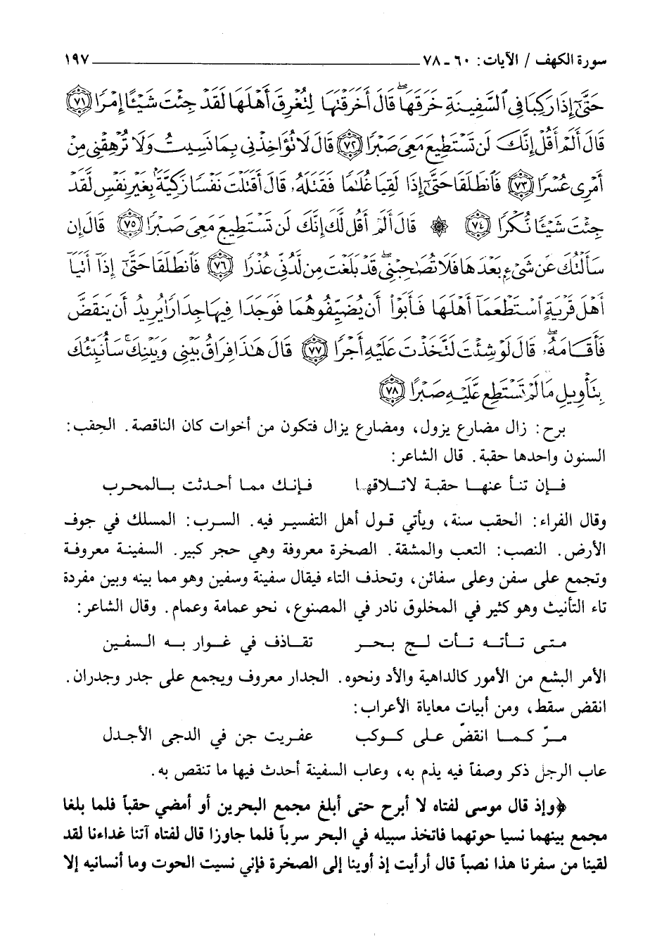 وَقَالَ الْفَرَّاءُ: الْحُقُبُ سَنَةٌ، وَيَأْتِي قَوْلُ أَهْلِ التَّفْسِيرِ فِيهِ. السَّرَبُ: الْمَسْلَكُ فِي جَوْفِ الْأَرْضِ. النَّصَبُ: التَّعَبُ وَالْمَشَقَّةُ. الصَّخْرَةُ مَعْرُوفَةٌ وَهِيَ حَجَرٌ كَبِيرٌ. السَّفِينَةُ مَعْرُوفَةٌ وَتُجْمَعُ عَلَى سُفُنٍ وَعَلَى سَفَائِنَ، وَتُحْذَفُ التَّاءُ فَيُقَالُ سَفِينَةٌ وَسَفِينٌ وَهُوَ مِمَّا بَيْنَهُ وَبَيْنَ مُفْرَدِهِ تَاءُ التَّأْنِيثِ وَهُوَ كَثِيرٌ فِي الْمَخْلُوقِ نَادِرٌ فِي الْمَصْنُوعِ، نحو عمامة وعمام. وَقَالَ الشَّاعِرُ:
