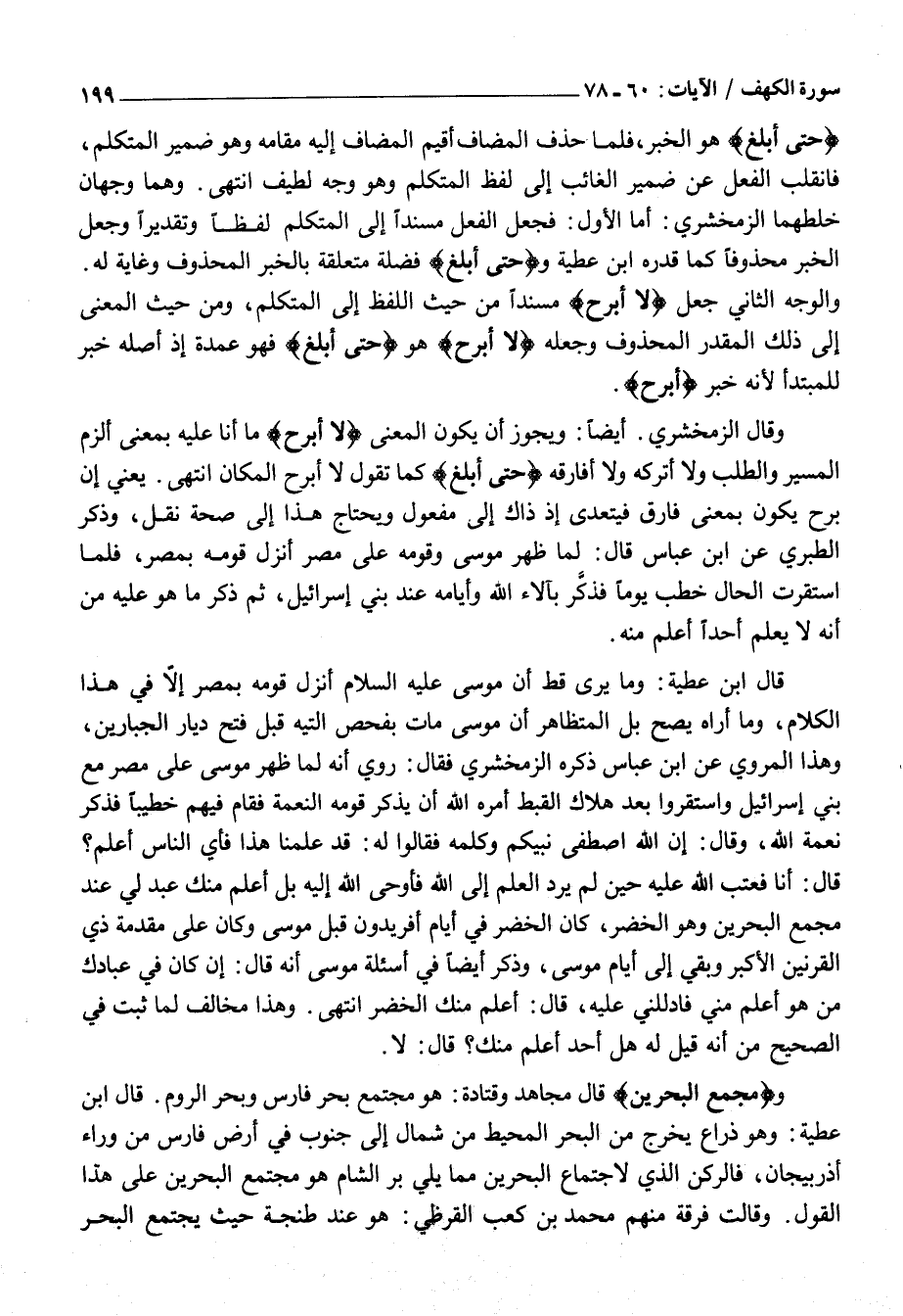 ومَجْمَعَ الْبَحْرَيْنِ قَالَ مُجَاهِدٌ وَقَتَادَةُ: هُوَ مُجْتَمَعُ بَحْرِ فَارِسَ وَبَحْرِ الرُّومِ. قَالَ ابْنُ عَطِيَّةَ: وَهُوَ ذِرَاعٌ يَخْرُجُ مِنَ الْبَحْرِ الْمُحِيطِ مِنْ شَمَالٍ إِلَى جَنُوبٍ فِي أَرْضِ فَارِسَ مِنْ وَرَاءِ أَذْرَبِيجَانَ، فَالرُّكْنُ الَّذِي لِاجْتِمَاعِ الْبَحْرَيْنِ مِمَّا يَلِي بَرَّ الشَّامِ هُوَ مُجْتَمَعُ الْبَحْرَيْنِ عَلَى هَذَا الْقَوْلِ. وَقَالَتْ فِرْقَةٌ مِنْهُمْ مُحَمَّدُ بْنُ كَعْبٍ الْقُرَظِيُّ: هُوَ عِنْدَ طَنْجَةَ حَيْثُ يَجْتَمِعُ الْبَحْرُ
