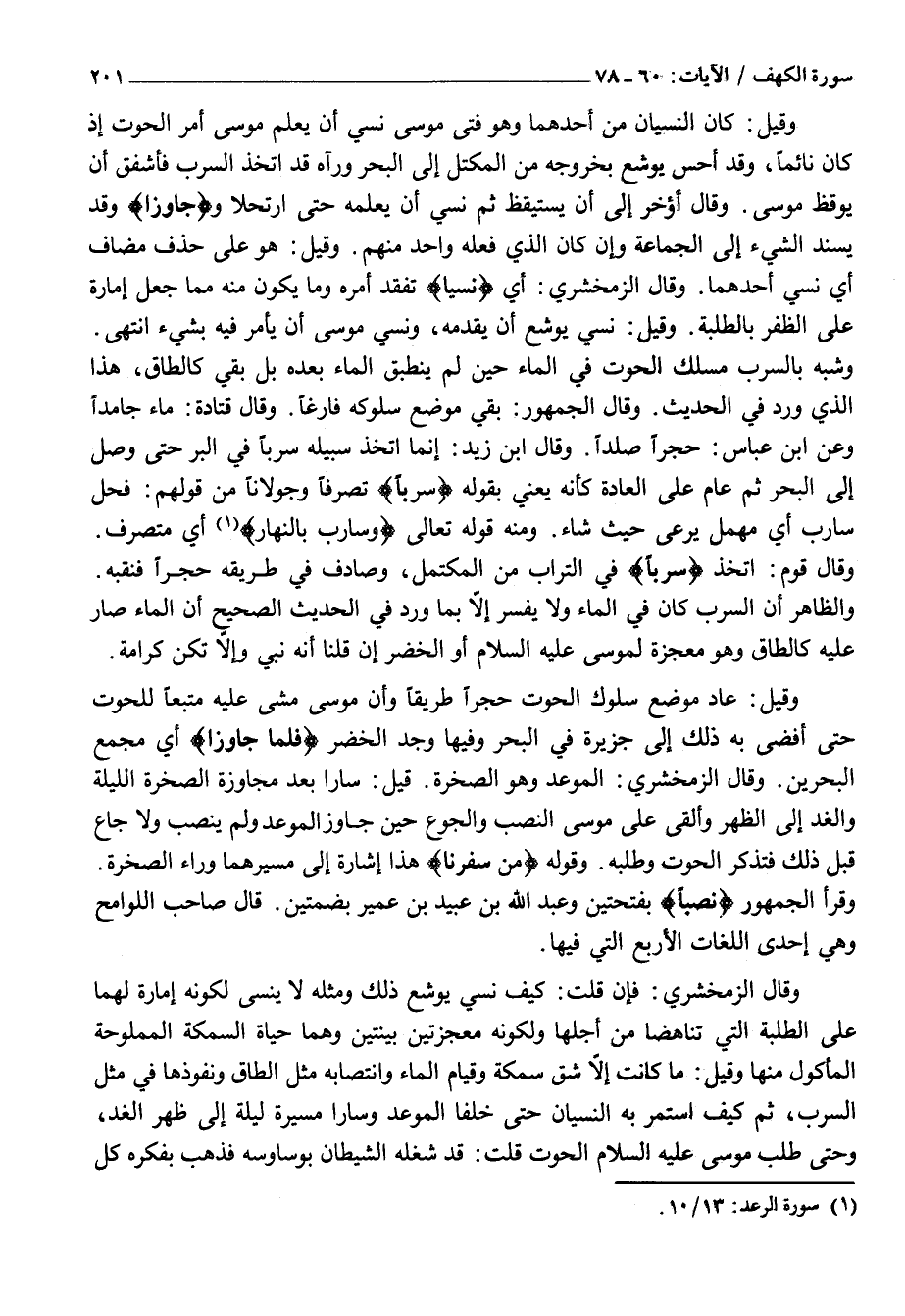 وَقَالَ الزَّمَخْشَرِيُّ: فَإِنْ قُلْتَ: كيف نَسِيَ يُوشَعُ ذَلِكَ وَمِثْلُهُ لَا يُنْسَى لِكَوْنِهِ أَمَارَةً لَهُمَا عَلَى الطِّلْبَةِ الَّتِي تَنَاهَضَا مِنْ أَجْلِهَا وَلِكَوْنِهِ مُعْجِزَتَيْنِ بَيِّنَتَيْنِ وَهُمَا حَيَاةُ السَّمَكَةِ الْمَمْلُوحَةِ الْمَأْكُولِ مِنْهَا وَقِيلَ: مَا كَانَتْ إِلَّا شِقَّ سَمَكَةٍ وَقِيَامُ الْمَاءِ وَانْتِصَابُهُ مِثْلُ الطَّاقِ وَنُفُوذُهَا فِي مِثْلِ السَّرَبِ، ثُمَّ كَيْفَ اسْتَمَرَّ بِهِ النِّسْيَانُ حَتَّى خَلَّفَا الْمَوْعِدَ وَسَارَا مَسِيرَةَ لَيْلَةٍ إِلَى ظُهْرِ الْغَدِ، وَحَتَّى طَلَبَ مُوسَى عَلَيْهِ السَّلَامُ الْحُوتَ قُلْتُ: قَدْ شَغَلَهُ الشَّيْطَانُ بِوَسَاوِسِهِ فذهب بفكره كل