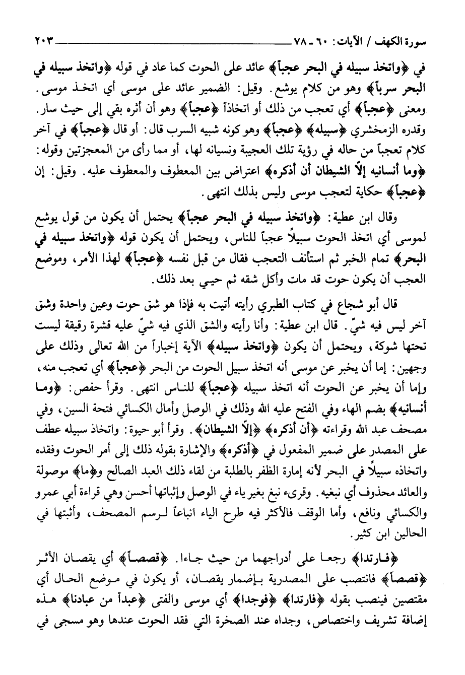 قَالَ أَبُو شُجَاعٍ فِي كِتَابِ الطَّبَرِيِّ رَأَيْتُهُ أَتَيْتُ بِهِ فَإِذَا هُوَ شَقُّ حُوتٍ وَعَيْنٌ وَاحِدَةٌ وَشَقٌّ آخَرُ لَيْسَ فِيهِ شيّ. قَالَ ابْنُ عَطِيَّةَ: وَأَنَا رَأَيْتُهُ وَالشِّقُّ الَّذِي فِيهِ شَيٌّ عَلَيْهِ قِشْرَةٌ رَقِيقَةٌ لَيْسَتْ تَحْتَهَا شَوْكَةٌ، وَيَحْتَمِلُ أَنْ يَكُونَ وَاتَّخَذَ سَبِيلَهُ الْآيَةَ إِخْبَارًا مِنَ اللَّهِ تَعَالَى وَذَلِكَ عَلَى وَجْهَيْنِ: إِمَّا أَنْ يُخْبِرَ عَنْ مُوسَى أَنَّهُ اتَّخَذَ سَبِيلَ الْحُوتِ مِنَ الْبَحْرِ عَجَباً أَيْ تَعَجَّبَ مِنْهُ، وَإِمَّا أَنْ يُخْبِرَ عَنِ الْحُوتِ أَنَّهُ اتَّخَذَ سَبِيلَهُ عَجَباً لِلنَّاسِ انْتَهَى. وَقَرَأَ حَفْصٌ: وَما أَنْسانِيهُ بِضَمِّ الْهَاءِ وَفِي الْفَتْحِ عَلَيْهِ اللَّهُ وَذَلِكَ فِي الْوَصْلِ وَأَمَالَ الْكِسَائِيُّ فَتْحَةَ السِّينِ، وَفِي مُصْحَفِ عَبْدِ اللَّهِ وَقِرَاءَتِهِ أَنْ أَذْكُرَهُ إِلَّا الشَّيْطانُ. وَقَرَأَ أَبُو حَيْوَةَ: وَاتِّخَاذُ سَبِيلِهِ عَطْفٌ عَلَى الْمَصْدَرِ عَلَى ضَمِيرِ الْمَفْعُولِ فِي أَذْكُرَهُ وَالْإِشَارَةُ بِقَوْلِهِ ذَلِكَ إِلَى أَمْرِ الْحُوتِ وَفَقْدِهِ وَاتِّخَاذِهِ سَبِيلًا فِي الْبَحْرِ لِأَنَّهُ أَمَارَةُ الظَّفَرِ بِالطِّلْبَةِ مِنْ لِقَاءِ ذَلِكَ الْعَبْدِ الصالح وَمَا مَوْصُولَةٌ وَالْعَائِدُ مَحْذُوفٌ أَيْ نَبْغِيهِ. وَقُرِئَ نَبْغِ بِغَيْرِ يَاءٍ فِي الْوَصْلِ وَإِثْبَاتُهَا أَحْسَنُ وَهِيَ قِرَاءَةُ أَبِي عَمْرٍو وَالْكِسَائِيِّ وَنَافِعٍ، وَأَمَّا الْوَقْفُ فَالْأَكْثَرُ فِيهِ طَرْحُ الْيَاءِ اتِّبَاعًا لِرَسْمِ الْمُصْحَفِ، وَأَثْبَتَهَا فِي الْحَالَيْنِ ابْنُ كَثِيرٍ.