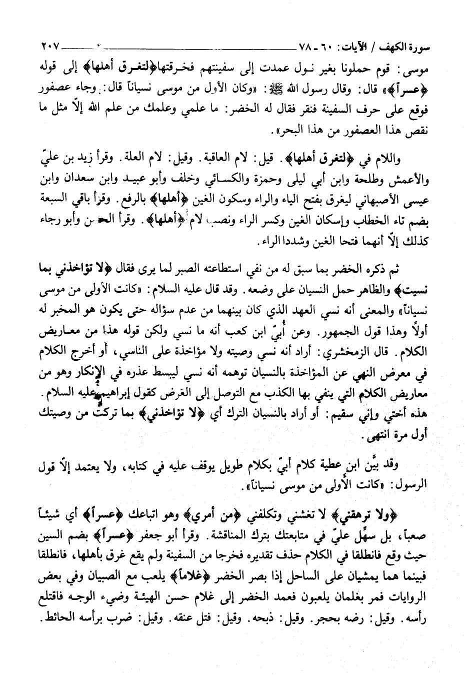 وَلا تُرْهِقْنِي لَا تُغْشِنِي وَتُكَلِّفْنِي مِنْ أَمْرِي وَهُوَ اتِّبَاعُكَ عُسْراً أَيْ شَيْئًا صَعْبًا، بَلْ سَهِّلْ عَلَيَّ فِي مُتَابَعَتِكَ بِتَرْكِ الْمُنَاقَشَةِ. وَقَرَأَ أَبُو جَعْفَرٍ عُسْراً بِضَمِّ السِّينِ حَيْثُ وَقَعَ فَانْطَلَقَا فِي الْكَلَامِ حَذْفٌ تَقْدِيرُهُ فَخَرَجَا مِنَ السَّفِينَةِ وَلَمْ يَقَعْ غَرَقٌ بِأَهْلِهَا، فَانْطَلَقَا فَبَيْنَمَا هُمَا يَمْشِيَانِ على الساحل إذا بصر الْخَضِرُ غُلاماً يَلْعَبُ مَعَ الصِّبْيَانِ وَفِي بَعْضِ الرِّوَايَاتِ فَمَرَّ بِغِلْمَانٍ يَلْعَبُونَ فَعَمَدَ الْخَضِرُ إِلَى غُلَامٍ حَسَنِ الْهَيْئَةِ وَضِيءِ الْوَجْهِ فَاقْتَلَعَ رَأْسَهُ. وَقِيلَ: رَضَّهُ بِحَجَرٍ. وَقِيلَ: ذَبَحَهُ. وَقِيلَ: فَتَلَ عُنُقَهُ. وَقِيلَ: ضَرَبَ بِرَأْسِهِ الْحَائِطَ.
