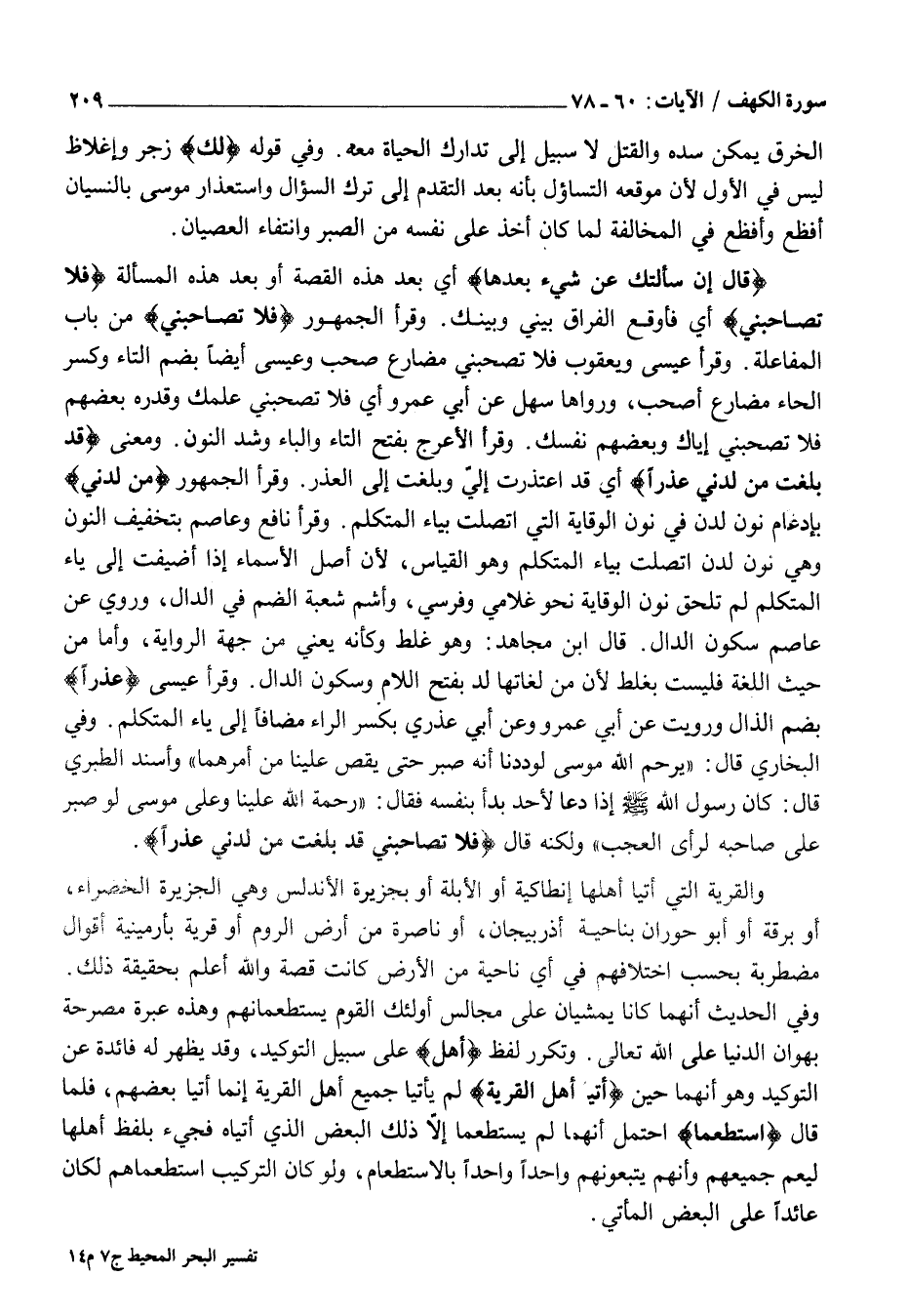 قالَ إِنْ سَأَلْتُكَ عَنْ شَيْءٍ بَعْدَها أَيْ بَعْدَ هَذِهِ الْقِصَّةِ أَوْ بَعْدَ هَذِهِ الْمَسْأَلَةِ فَلا تُصاحِبْنِي أَيْ فَأَوْقِعِ الْفِرَاقَ بَيْنِي وَبَيْنَكَ. وَقَرَأَ الْجُمْهُورُ فَلا تُصاحِبْنِي مِنْ بَابِ الْمُفَاعَلَةِ. وَقَرَأَ عِيسَى وَيَعْقُوبُ فَلَا تَصْحَبْنِي مُضَارِعُ صَحِبَ وَعِيسَى أَيْضًا بِضَمِّ التَّاءِ وَكَسْرِ الْحَاءِ مُضَارِعُ أَصْحَبَ، وَرَوَاهَا سَهْلٌ عَنْ أَبِي عَمْرٍو أَيْ فَلَا تُصْحِبْنِي عِلْمَكَ وَقَدَّرَهُ بَعْضُهُمْ فَلَا تُصْحِبْنِي إِيَّاكَ وَبَعْضُهُمْ نَفْسَكَ. وَقَرَأَ الْأَعْرَجُ بِفَتْحِ التَّاءِ وَالْبَاءِ وَشَدِّ النُّونِ. وَمَعْنَى قَدْ بَلَغْتَ مِنْ لَدُنِّي عُذْراً أَيْ قَدِ اعْتَذَرْتَ إِلَيَّ وَبَلَغْتَ إِلَى الْعُذْرِ. وَقَرَأَ الْجُمْهُورُ مِنْ لَدُنِّي بِإِدْغَامِ نُونِ لَدُنْ فِي نُونِ الْوِقَايَةِ الَّتِي اتَّصَلَتْ بِيَاءِ الْمُتَكَلِّمِ. وَقَرَأَ نَافِعٌ وَعَاصِمٌ بِتَخْفِيفِ النُّونِ وَهِيَ نُونُ لَدُنِ اتَّصَلَتْ بِيَاءِ الْمُتَكَلِّمِ وَهُوَ الْقِيَاسُ، لِأَنَّ أَصْلَ الْأَسْمَاءِ إِذَا أُضِيفَتْ إِلَى يَاءِ الْمُتَكَلِّمِ لَمْ تَلْحَقْ نُونُ الْوِقَايَةِ نَحْوُ غُلَامِي وَفَرَسِي، وَأَشَمَّ شُعْبَةُ الضَّمَّ فِي الدَّالِ، وَرُوِيَ عَنْ عَاصِمٍ سُكُونُ الدَّالِ. قَالَ ابْنُ مُجَاهِدٍ: وَهُوَ غَلَطٌ وَكَأَنَّهُ يَعْنِي مِنْ جِهَةِ الرِّوَايَةِ، وَأَمَّا مِنْ حَيْثُ اللُّغَةُ فَلَيْسَتْ بِغَلَطٍ لِأَنَّ مِنْ لُغَاتِهَا لَدْ بِفَتْحِ اللَّامِ وَسُكُونِ الدَّالِ. وَقَرَأَ عِيسَى عُذْراً بِضَمِّ الذَّالِ وَرُوِيَتْ عَنْ أَبِي عَمْرٍو وَعَنْ أُبَيٍّ عُذْرِي بِكَسْرِ الرَّاءِ مُضَافًا إِلَى يَاءِ الْمُتَكَلِّمِ.