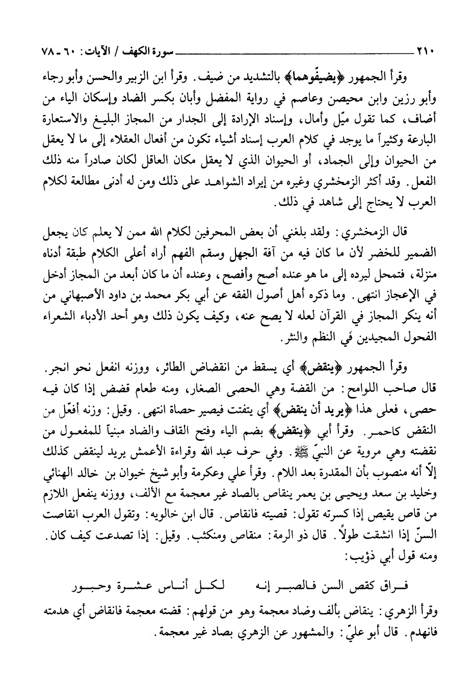 قَالَ الزَّمَخْشَرِيُّ: وَلَقَدْ بَلَغَنِي أَنَّ بَعْضَ الْمُحَرِّفِينَ لِكَلَامِ اللَّهِ مِمَّنْ لَا يَعْلَمُ كَانَ يَجْعَلُ الضَّمِيرَ لِلْخَضِرِ لِأَنَّ مَا كَانَ فِيهِ مِنَ آفَةِ الْجَهْلِ وَسُقْمِ الْفَهْمِ أَرَاهُ أَعْلَى الْكَلَامَ طَبَقَةً أَدْنَاهُ مَنْزِلَةً، فَتَمَحَّلَ لِيَرُدَّهُ إِلَى مَا هُوَ عِنْدَهُ أَصَحُّ وَأَفْصَحُ، وَعِنْدَهُ أَنَّ مَا كَانَ أَبْعَدَ مِنَ الْمَجَازِ أَدْخَلُ فِي الْإِعْجَازِ انْتَهَى. وَمَا ذَكَرَهُ أَهْلُ أُصُولِ الْفِقْهِ عَنْ أَبِي بَكْرٍ مُحَمَّدِ بْنِ دَاوُدَ الْأَصْبَهَانِيِّ مِنْ أَنَّهُ يُنْكِرُ الْمَجَازَ فِي الْقُرْآنِ لَعَلَّهُ لَا يَصِحُّ عَنْهُ، وَكَيْفَ يَكُونُ ذَلِكَ وَهُوَ أَحَدُ الْأُدَبَاءِ الشُّعَرَاءِ الْفُحُولِ الْمُجِيدِينَ فِي النَّظْمِ وَالنَّثْرِ.