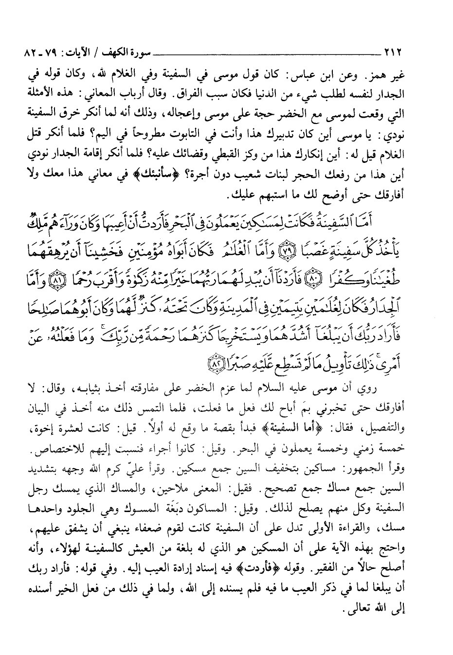 أَمَّا السَّفِينَةُ فَكانَتْ لِمَساكِينَ يَعْمَلُونَ فِي الْبَحْرِ فَأَرَدْتُ أَنْ أَعِيبَها وَكانَ وَراءَهُمْ مَلِكٌ يَأْخُذُ كُلَّ سَفِينَةٍ غَصْباً (79) وَأَمَّا الْغُلامُ فَكانَ أَبَواهُ مُؤْمِنَيْنِ فَخَشِينا أَنْ يُرْهِقَهُما طُغْياناً وَكُفْراً (80) فَأَرَدْنا أَنْ يُبْدِلَهُما رَبُّهُما خَيْراً مِنْهُ زَكاةً وَأَقْرَبَ رُحْماً (81) وَأَمَّا الْجِدارُ فَكانَ لِغُلامَيْنِ يَتِيمَيْنِ فِي الْمَدِينَةِ وَكانَ تَحْتَهُ كَنْزٌ لَهُما وَكانَ أَبُوهُما صالِحاً فَأَرادَ رَبُّكَ أَنْ يَبْلُغا أَشُدَّهُما وَيَسْتَخْرِجا كَنزَهُما رَحْمَةً مِنْ رَبِّكَ وَما فَعَلْتُهُ عَنْ أَمْرِي ذلِكَ تَأْوِيلُ مَا لَمْ تَسْطِعْ عَلَيْهِ صَبْراً (82)