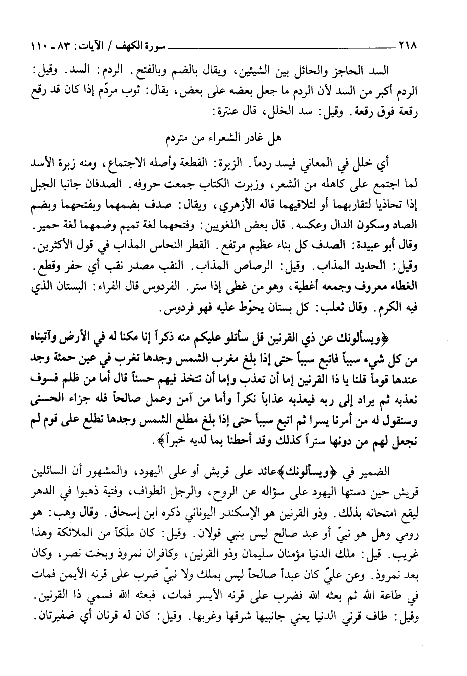الضَّمِيرُ فِي وَيَسْئَلُونَكَ عَائِدٌ عَلَى قُرَيْشٍ أَوْ عَلَى الْيَهُودِ، وَالْمَشْهُورُ أَنَّ السَّائِلِينَ قُرَيْشٌ حِينَ دَسَّتْهَا الْيَهُودُ عَلَى سُؤَالِهِ عَنِ الرُّوحِ، وَالرَّجُلِ الطَّوَّافِ، وَفِتْيَةٍ ذَهَبُوا فِي الدَّهْرِ لِيَقَعَ امْتِحَانُهُ بِذَلِكَ. وَذُو الْقَرْنَيْنِ هُوَ الْإِسْكَنْدَرُ الْيُونَانِيُّ ذَكَرَهُ ابْنُ إِسْحَاقَ. وَقَالَ وَهْبٌ: هُوَ رُومِيٌّ وَهَلْ هُوَ نَبِيٌّ أَوْ عَبْدٌ صَالِحٌ لَيْسَ بِنَبِيٍّ قَوْلَانِ. وَقِيلَ: كَانَ مَلَكًا مِنَ الْمَلَائِكَةِ وَهَذَا غَرِيبٌ. قِيلَ: مَلَكَ الدُّنْيَا مُؤْمِنَانِ سُلَيْمَانُ وَذُو الْقَرْنَيْنِ، وَكَافِرَانِ نُمْرُوذُ وَبُخْتُ نَصَّرَ، وَكَانَ بَعْدَ نُمْرُوذَ.