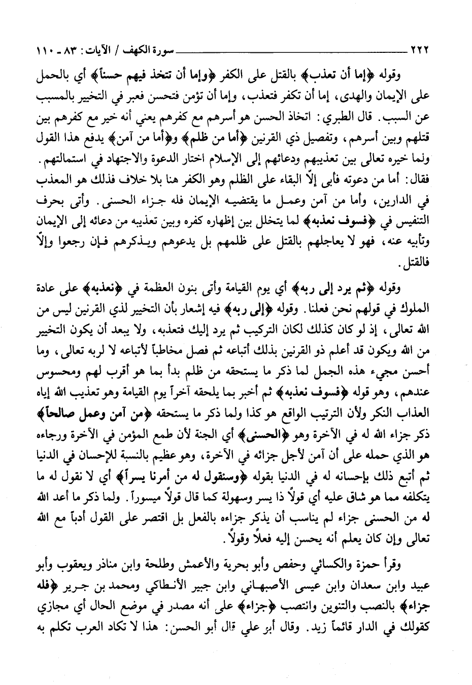 وَقَوْلُهُ ثُمَّ يُرَدُّ إِلى رَبِّهِ أَيْ يَوْمَ الْقِيَامَةِ وَأَتَى بِنُونِ الْعَظَمَةِ فِي نُعَذِّبُهُ عَلَى عَادَةِ الْمُلُوكِ فِي قَوْلِهِمْ نَحْنُ فَعَلْنَا. وَقَوْلُهُ إِلى رَبِّهِ فِيهِ إِشْعَارٌ بِأَنَّ التَّخْيِيرَ لِذِي الْقَرْنَيْنِ لَيْسَ مِنَ اللَّهِ تَعَالَى، إِذْ لَوْ كَانَ كَذَلِكَ لَكَانَ التَّرْكِيبُ ثُمَّ يُرَدُّ إِلَيْكَ فَتُعَذِّبُهُ، وَلَا يَبْعُدُ أَنْ يَكُونَ التَّخْيِيرُ مِنَ اللَّهِ وَيَكُونُ قَدْ أَعْلَمَ ذُو الْقَرْنَيْنِ بِذَلِكَ أَتْبَاعَهُ ثُمَّ فَصَّلَ مُخَاطِبًا لِأَتْبَاعِهِ لَا لِرَبِّهِ تَعَالَى، وَمَا أَحْسَنَ مَجِيءُ هَذِهِ الْجُمَلِ لَمَّا ذَكَرَ مَا يَسْتَحِقُّهُ مِنْ ظُلْمٍ بَدَأَ بِمَا هُوَ أَقْرَبُ لَهُمْ وَمَحْسُوسٌ عِنْدَهُمْ، وَهُوَ قَوْلُهُ فَسَوْفَ نُعَذِّبُهُ ثُمَّ أَخْبَرَ بِمَا يَلْحَقُهُ آخِرًا يَوْمَ الْقِيَامَةِ وَهُوَ تَعْذِيبُ اللَّهِ إِيَّاهُ الْعَذَابَ النُّكُرَ وَلِأَنَّ التَّرْتِيبَ الْوَاقِعَ هُوَ كَذَا وَلَمَّا ذكر ما يستحقه مَنْ آمَنَ وَعَمِلَ صالِحاً ذَكَرَ جَزَاءَ اللَّهِ لَهُ فِي الْآخِرَةِ وَهُوَ الْحُسْنى أَيِ الْجَنَّةُ لِأَنَّ طَمَعَ الْمُؤْمِنِ فِي الْآخِرَةِ وَرَجَاءَهُ هُوَ الَّذِي حَمَلَهُ عَلَى أَنْ آمَنَ لِأَجْلِ جَزَائِهِ فِي الْآخِرَةِ، وَهُوَ عَظِيمٌ بِالنِّسْبَةِ لِلْإِحْسَانِ فِي الدُّنْيَا ثُمَّ أَتْبَعَ ذَلِكَ بِإِحْسَانِهِ لَهُ فِي الدُّنْيَا بِقَوْلِهِ وَسَنَقُولُ لَهُ مِنْ أَمْرِنا يُسْراً أَيْ لَا نَقُولُ لَهُ مَا يَتَكَلَّفُهُ مِمَّا هُوَ شَاقٌّ عَلَيْهِ أَيْ قَوْلًا ذَا يُسْرٍ وَسُهُولَةٍ كَمَا قَالَ قَوْلًا مَيْسُورًا. وَلَمَّا ذَكَرَ مَا أَعَدَّ اللَّهُ لَهُ مِنَ الْحُسْنَى جَزَاءً لَمْ يُنَاسِبْ أَنْ يَذْكُرَ جَزَاءَهُ بِالْفِعْلِ بَلِ اقْتَصَرَ عَلَى الْقَوْلِ أَدَبًا مَعَ اللَّهِ تَعَالَى وَإِنْ كَانَ يَعْلَمُ أَنَّهُ يُحْسِنُ إِلَيْهِ فِعْلًا وَقَوْلًا.